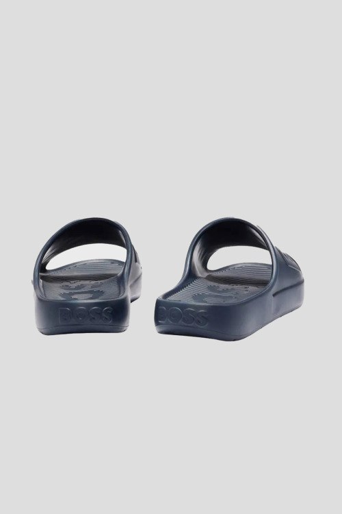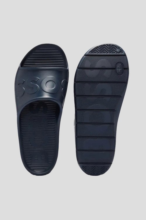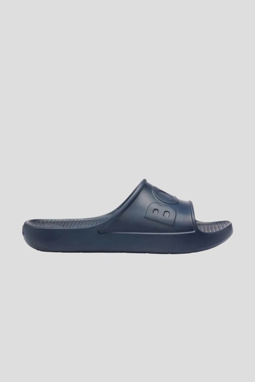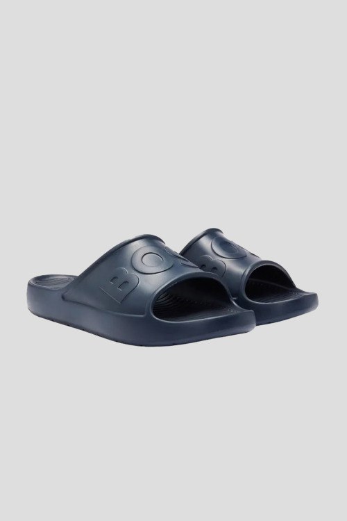 Детали: Мужские темно-синие слайдеры Darian от Hugo Boss (Хуго Босс). Закругленный носок, широкий ремешок, тиснение с логотипом бренда