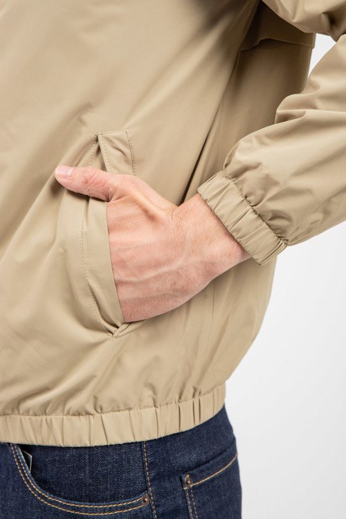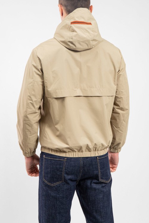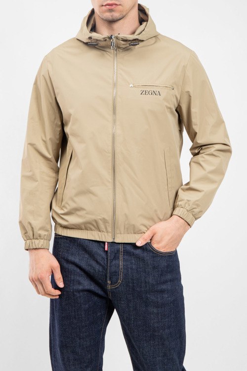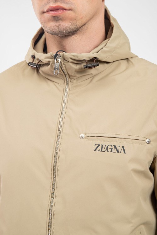 Мужская бежевая ветровка от Ermenegildo Zegna (Эрменеджильдо Зенья). Вшитый капюшон, карман с логотипом на груди, боковые карманы, застежка-молния, классическая длина, манжеты и нижний край на резинке.