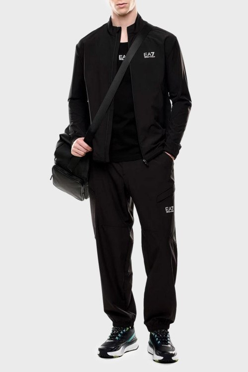Детали: Мужская черная ветровка из полиэстера и эластана от EA7 Emporio Armani (ЕА7 Эмпорио Армани). Классическая длина, высокий воротник-стойка, застежка на молнию, брендированный принт, прорезные карманы
