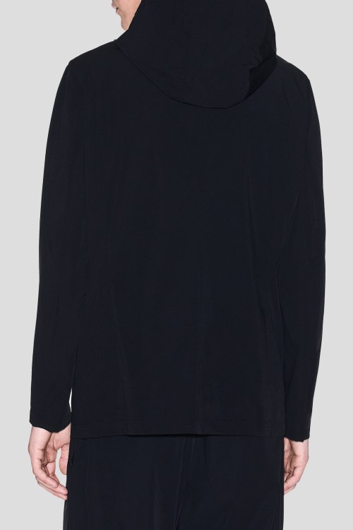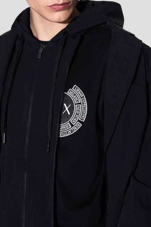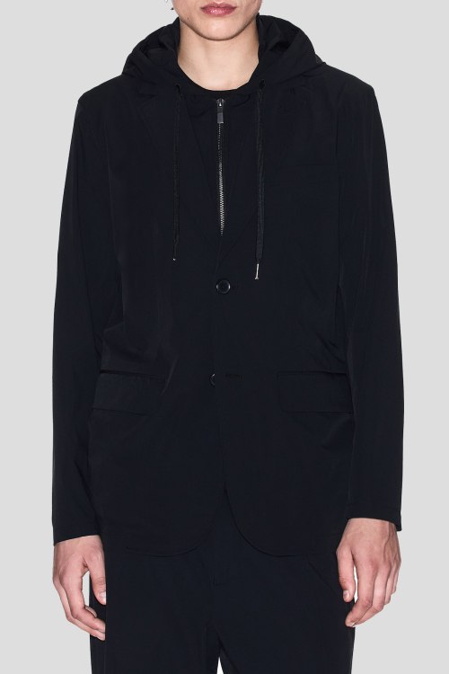 Детали: Мужская черная ветровка-пиджак от Armani Exchange (Армани Эксчендж). Съемная вставка с капюшоном, отложной воротник, два кармана с клапаном, застежка на две пуговицы, классическая длина