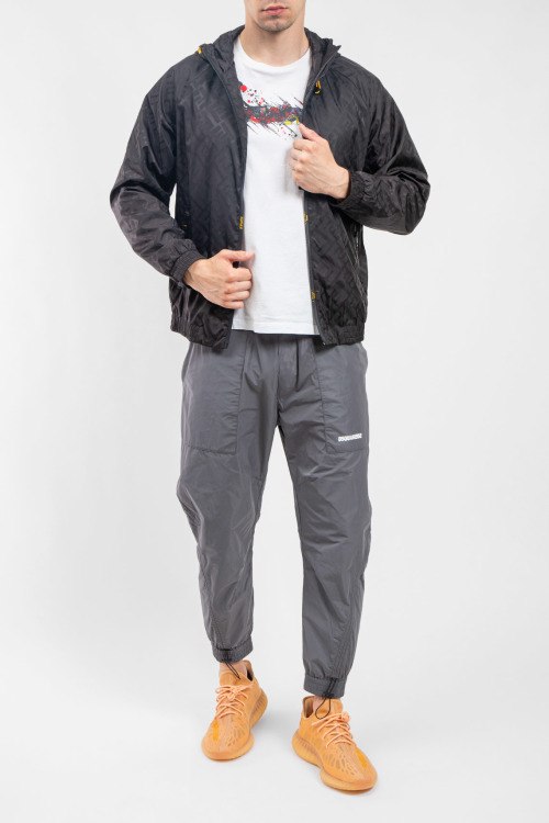 Мужская черная ветровка от Fendi (Фенди). Монограмма по всей поверхности, вшитый капюшон, боковые карманы на молнии, застежка-молния, желтая подкладка, классическая длина, манжеты и нижний край на резинке.