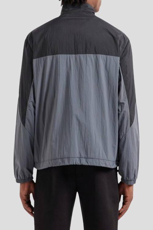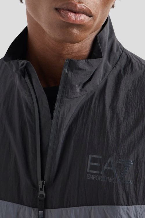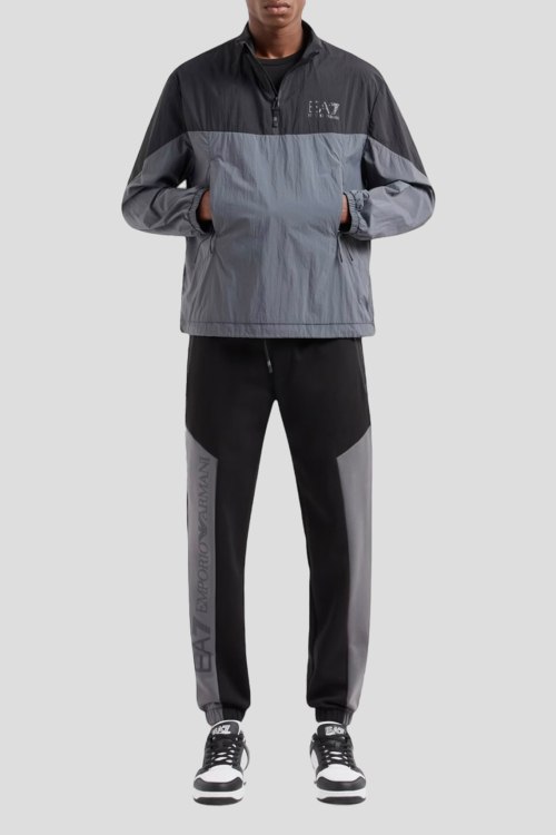 Детали: Мужская черно-серая ветровка Athletic Colour Block из технической ткани от EA7 Emporio Armani (ЕА7 Эмпорио Армани). Логотип на груди, высокий воротник, боковые карманы, застежка-молния, классическая длина, манжеты и нижний край на резинке