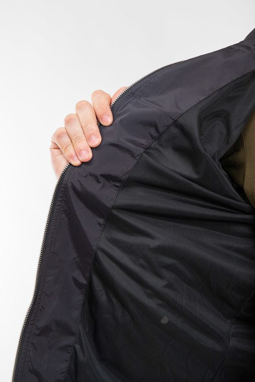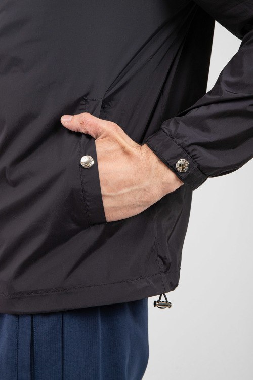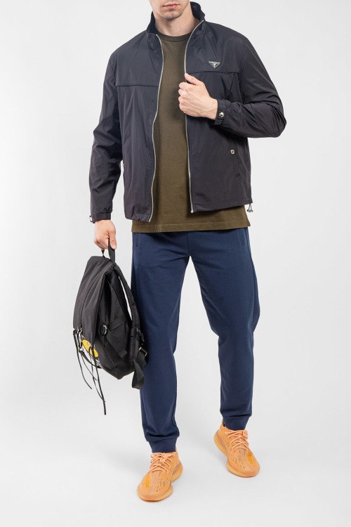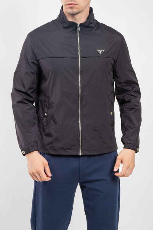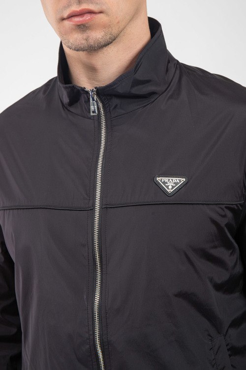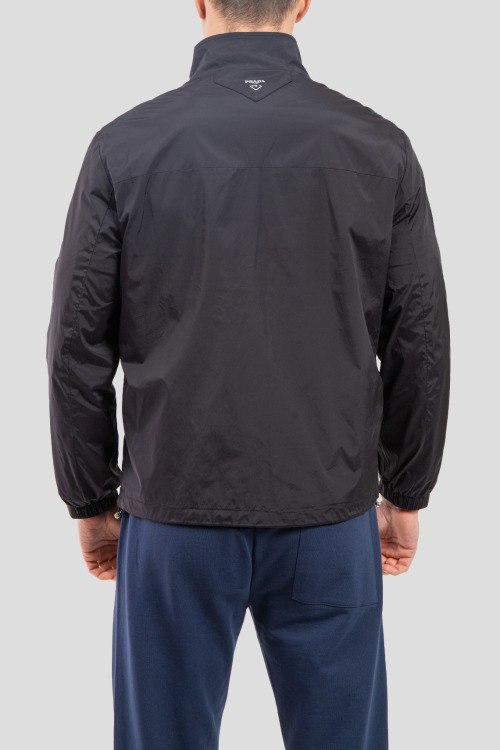 Мужская черная ветровка от Prada (Прада). Высокий воротник, нашивка с логотипом на груди, боковые карманы на кнопке, застежка-молния, классическая длина, регулируемые манжеты.