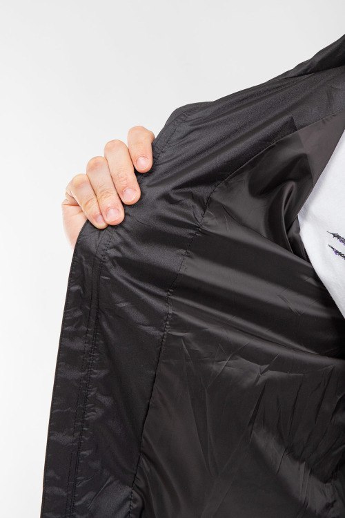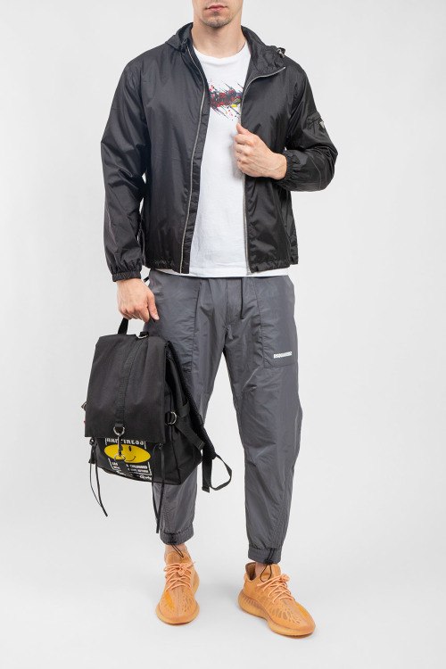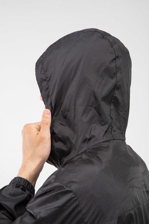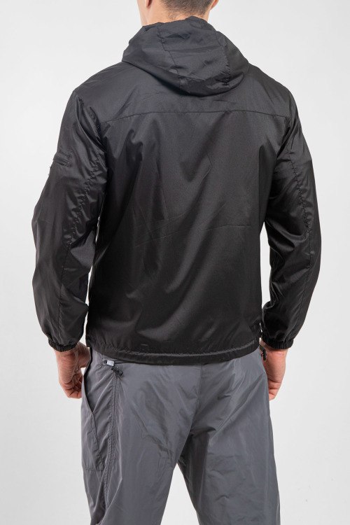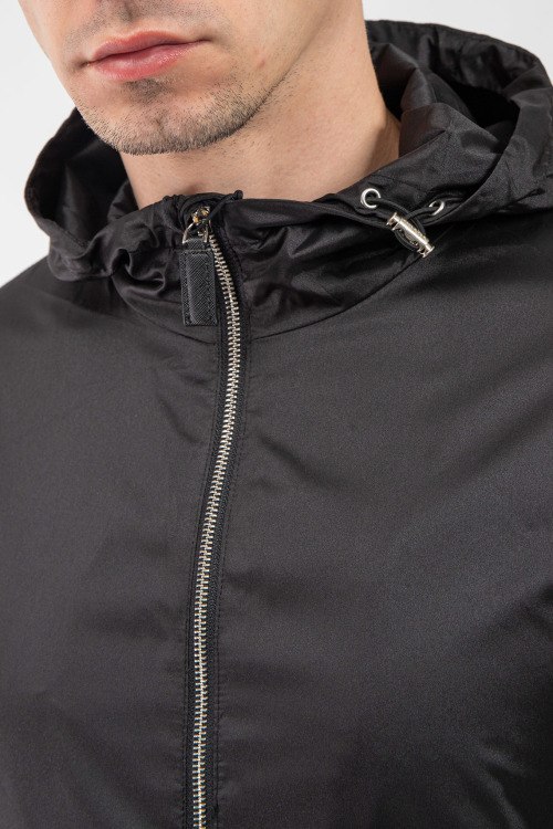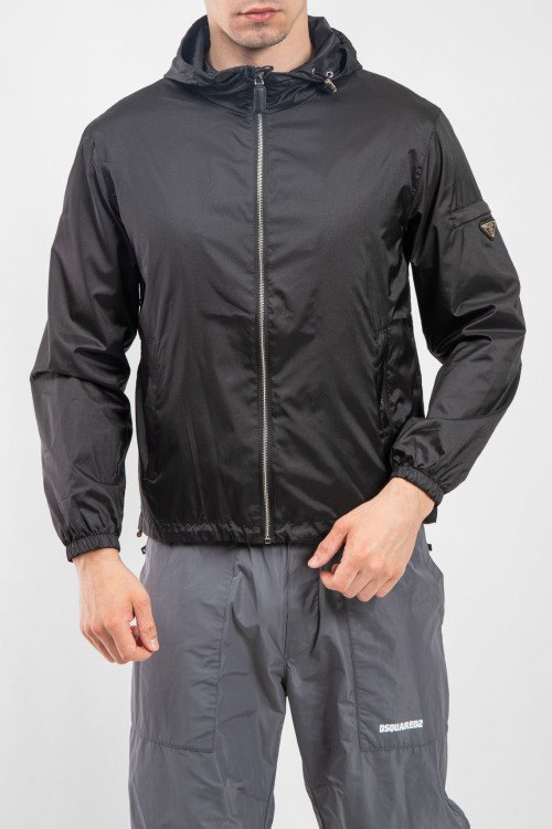 Мужская черная ветровка от Prada (Прада). Вшитый капюшон, логотип на рукаве, боковые карманы, застежка-молния, манжеты на резинке, классическая длина.