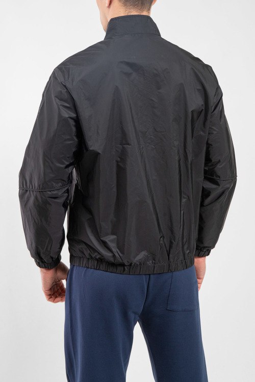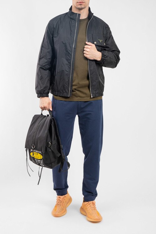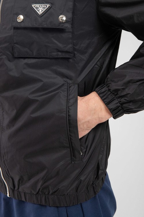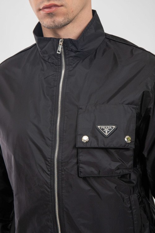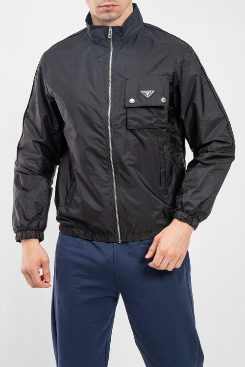 Мужская черная ветровка от Prada (Прада). Высокий воротник, карман с логотипом на груди, боковые карманы на молнии, застежка-молния, классическая длина, манжеты и нижний край на резинке.