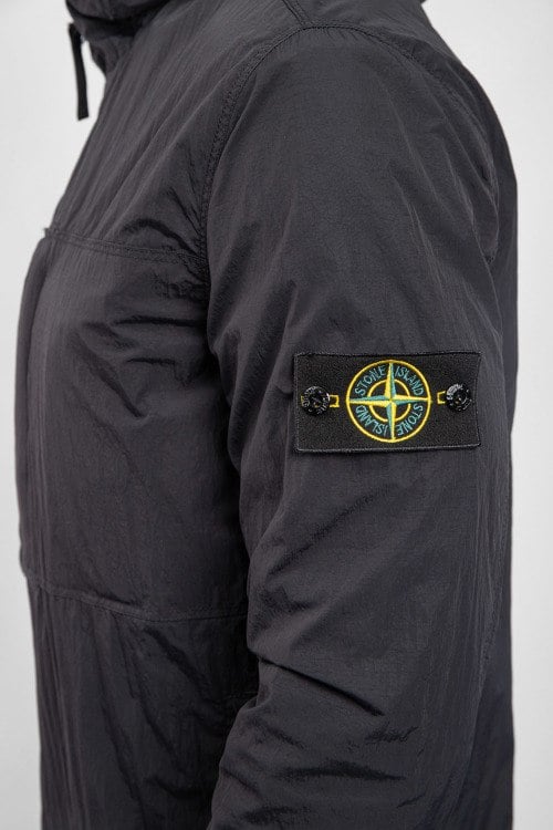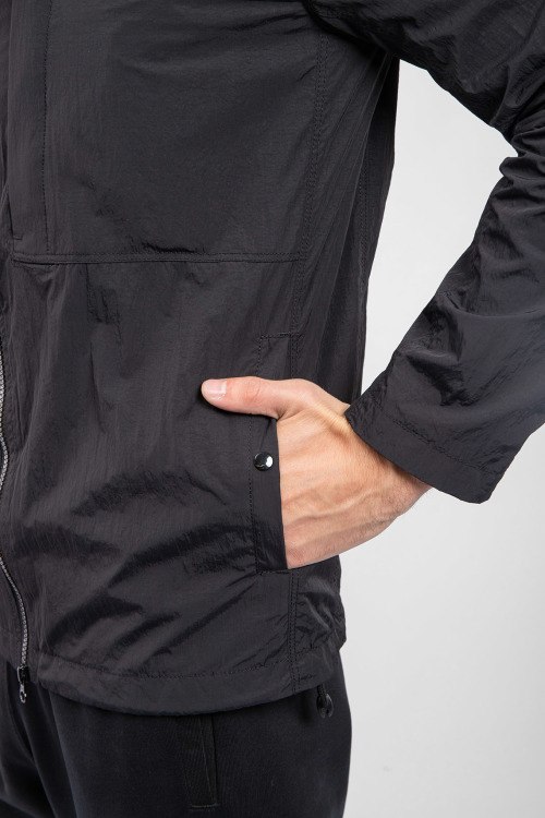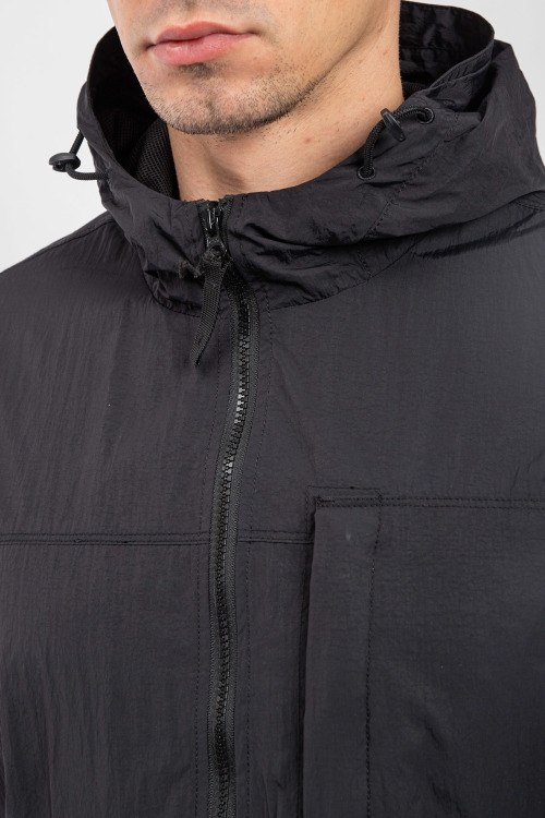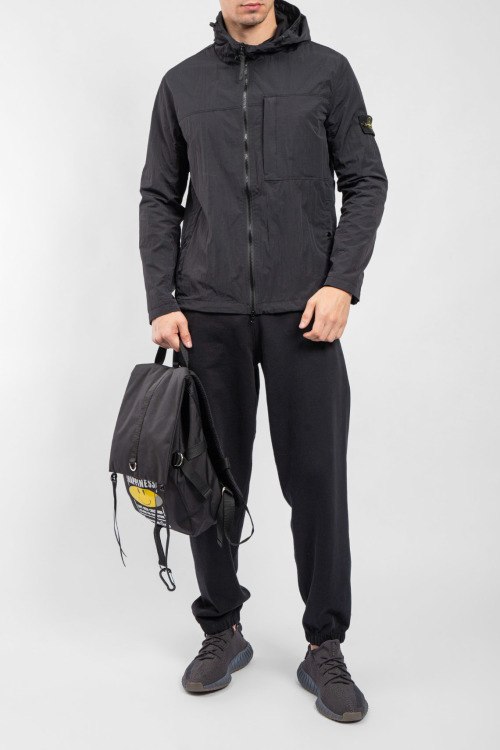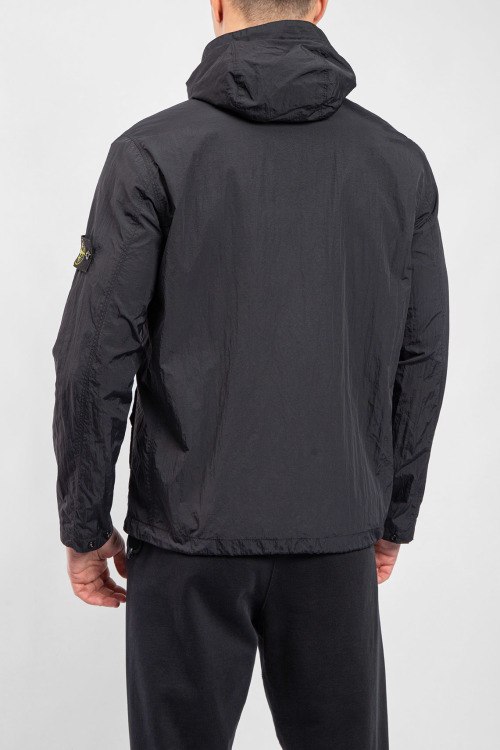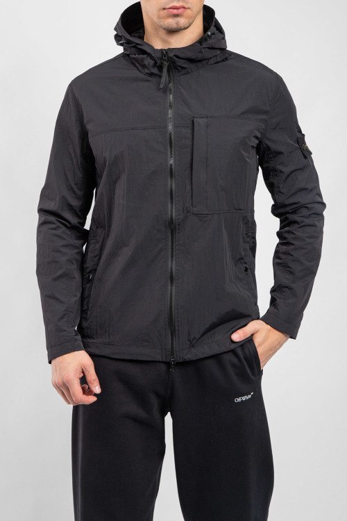 Мужская черная ветровка от Stone Island (Стоун Айленд). Вшитый капюшон, нашивка с логотипом на рукаве, боковые карманы на кнопке, карман на груди, застежка-молния, классическая длина.