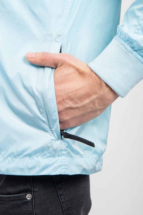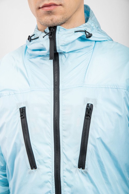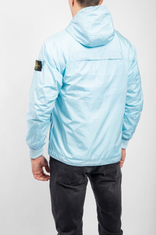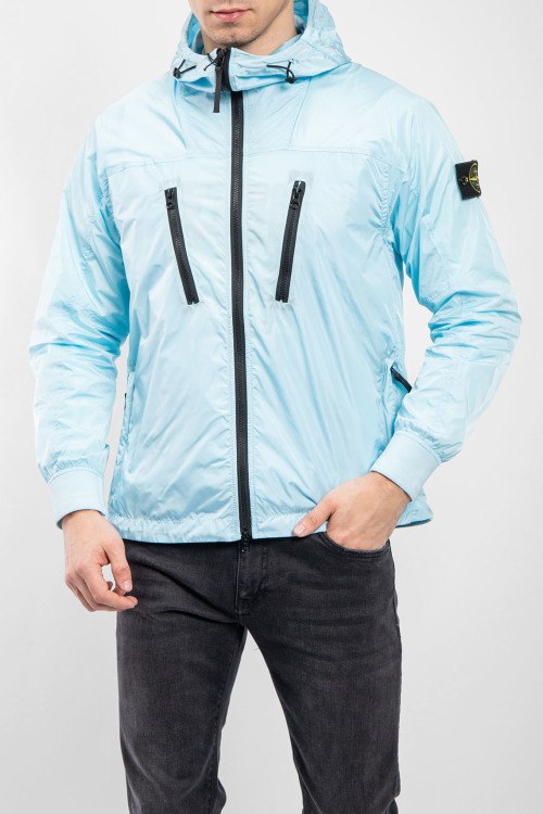Мужская голубая ветровка от Stone Island (Стоун Айленд). Вшитый капюшон, нашивка с логотипом на рукаве, четыре передних кармана, застежка-молния, трикотажные манжеты, классическая длина.