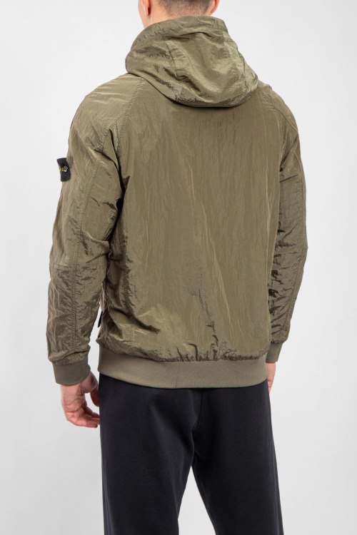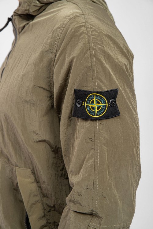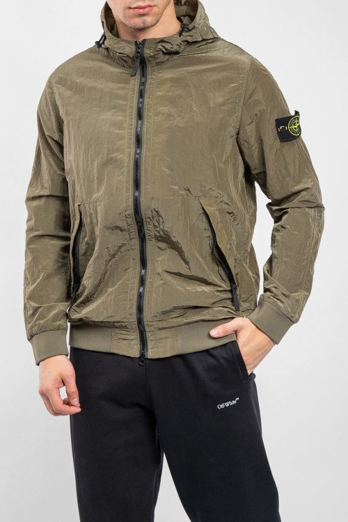 Мужская ветровка цвета светлого хаки от Stone Island (Стоун Айленд). Вшитый капюшон, нашивка с логотипом на рукаве, боковые карманы на молнии, застежка-молния, классическая длина, трикотажные манжеты и нижний край.
