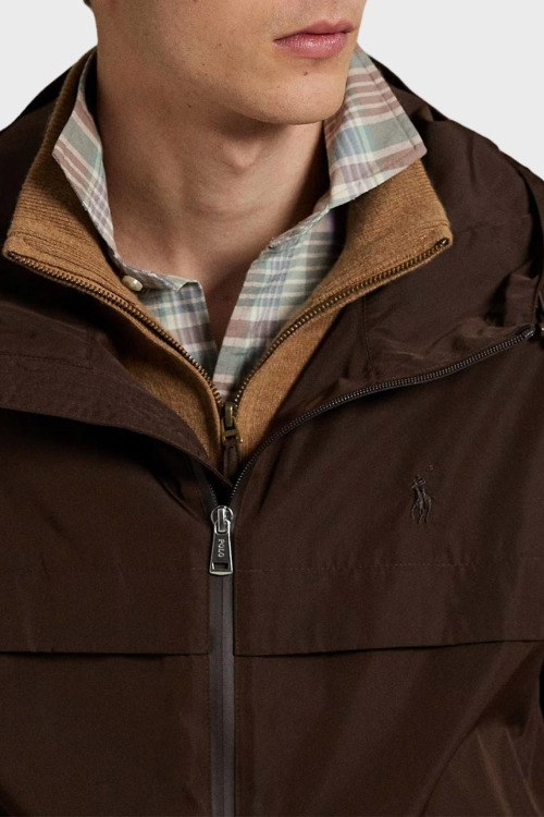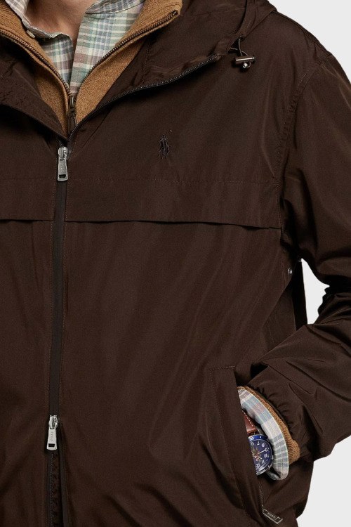 Детали: Мужская коричневая ветровка из полиэстера от Polo Ralph Lauren (Поло Ральф Лорен). Классическая длина, застежка на молнию, вшитый капюшон, прорезные карманы