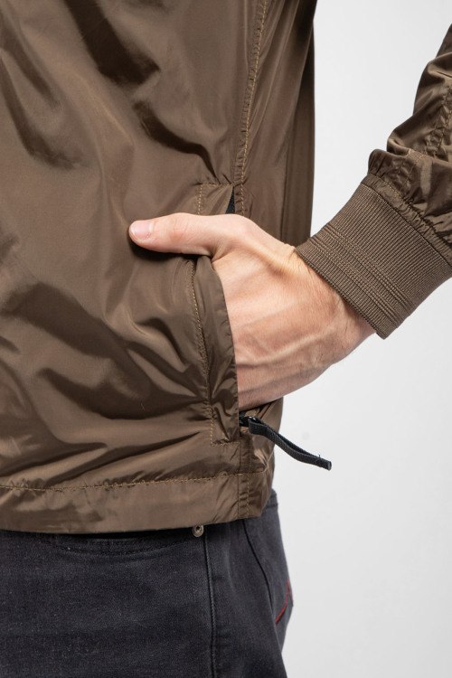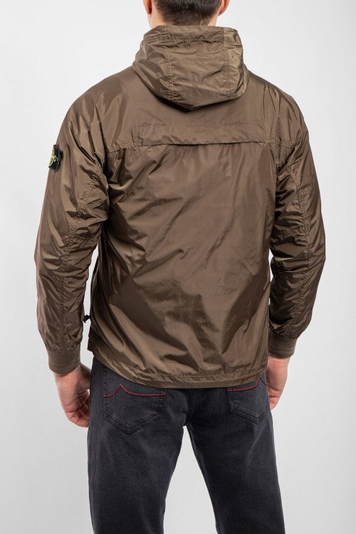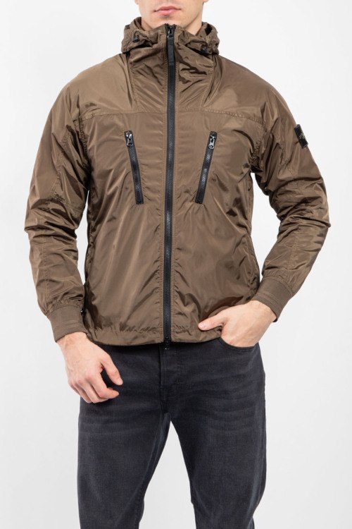 Мужская коричневая ветровка от Stone Island (Стоун Айленд). Вшитый капюшон, нашивка с логотипом на рукаве, четыре передних кармана, застежка-молния, трикотажные манжеты, классическая длина.