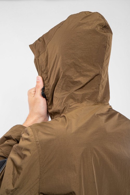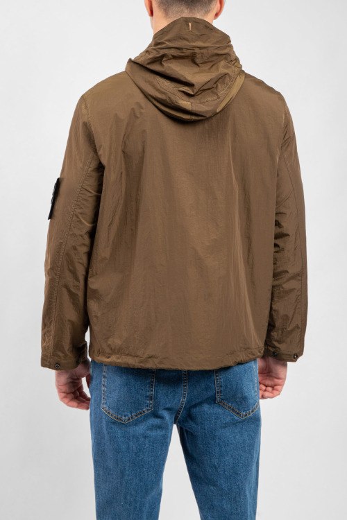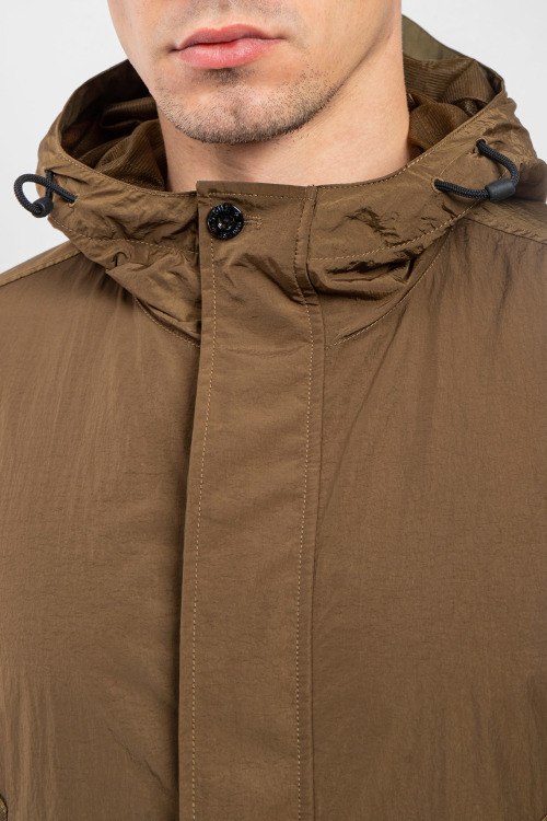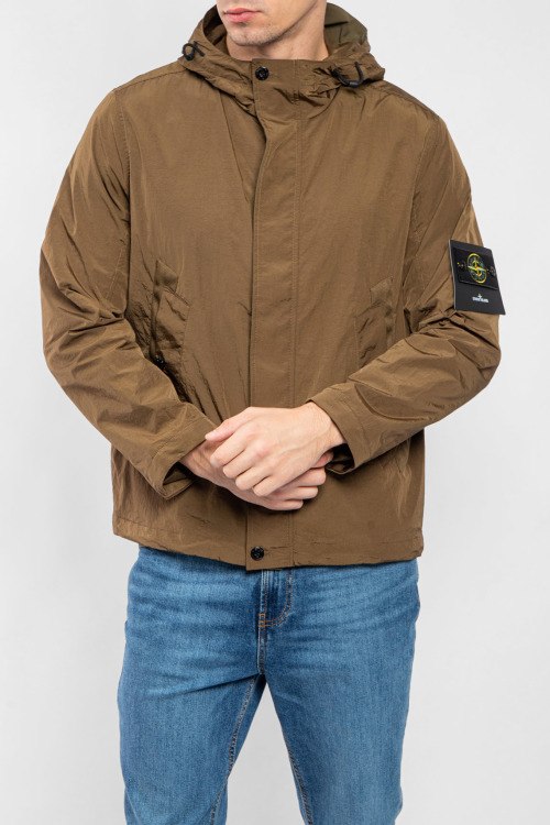 Мужская светло-коричневая ветровка от Stone Island (Стоун Айленд). Вшитый капюшон, нашивка с логотипом на рукаве, боковые карманы, один внутренний карман, застежка на молнию и кнопки, классическая длина.