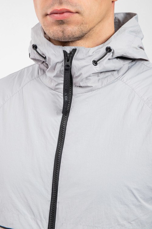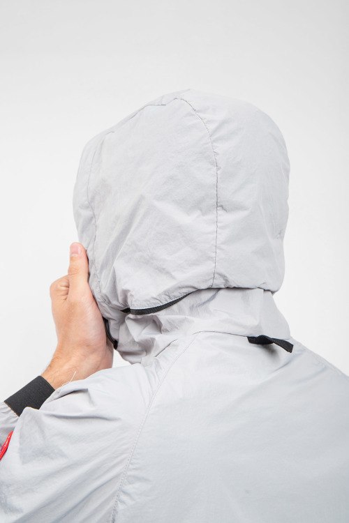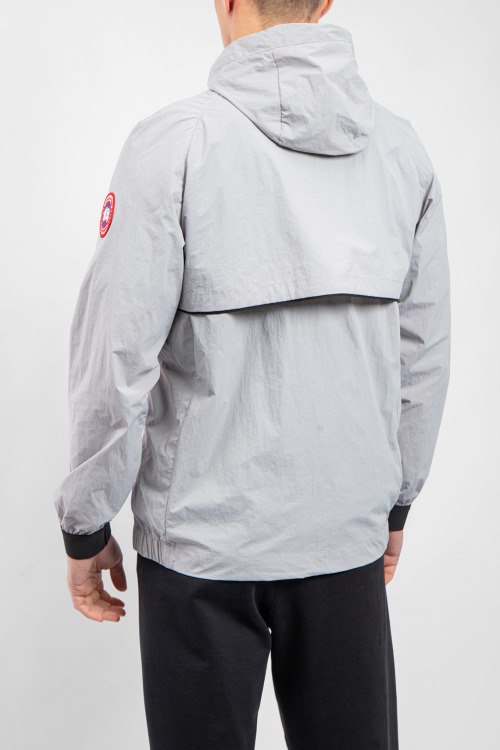 Мужская светло-серая ветровка от Canada Goose (Канада Гус). Вшитый капюшон, нашивка с логотипом на рукаве, боковые карманы на молнии, застежка-молния, эластичные манжеты, классическая длина.