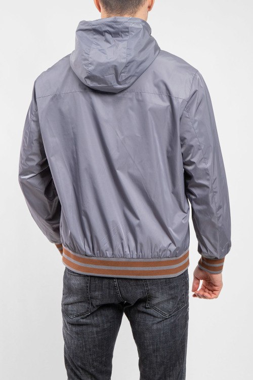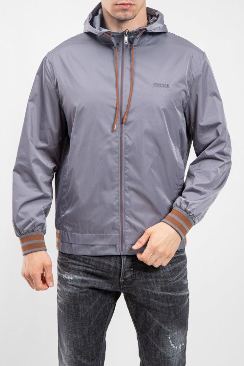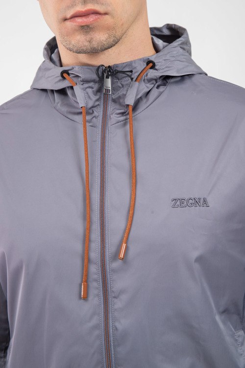 Мужская серая ветровка от Ermenegildo Zegna (Эрменеджильдо Зенья). Вшитый капюшон, вышитый логотип на груди, боковые карманы, застежка-молния, классическая длина, трикотажные манжеты и нижний край.