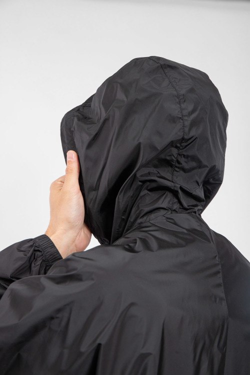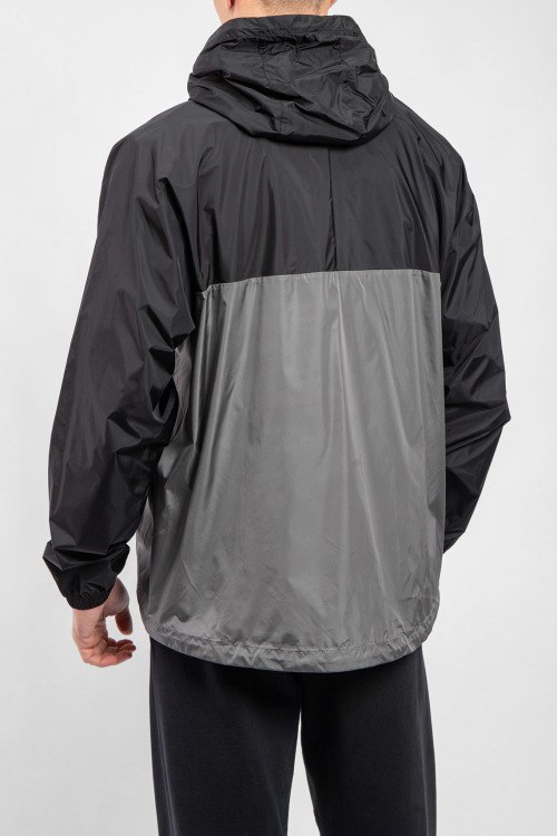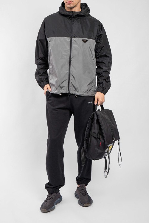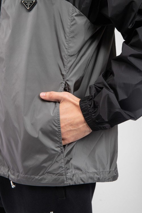 Мужская серо-черная ветровка от Prada (Прада). Вшитый капюшон, застежка на молнию, длинные рукава, эластичная резинка на манжетах, боковые карманы, патч-лого на груди, классическая длина.