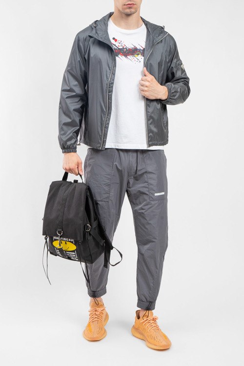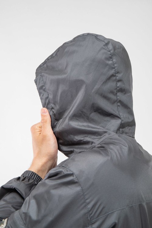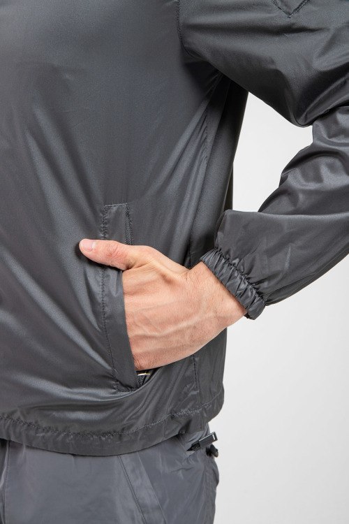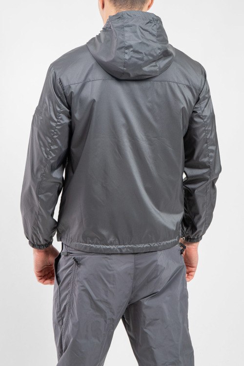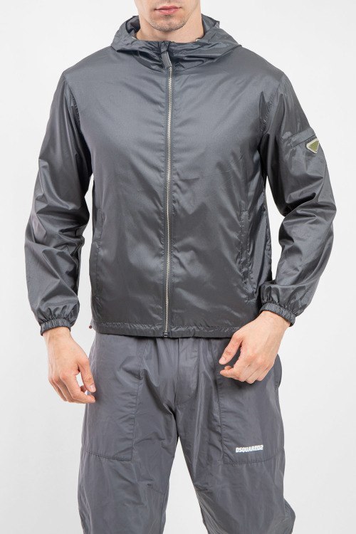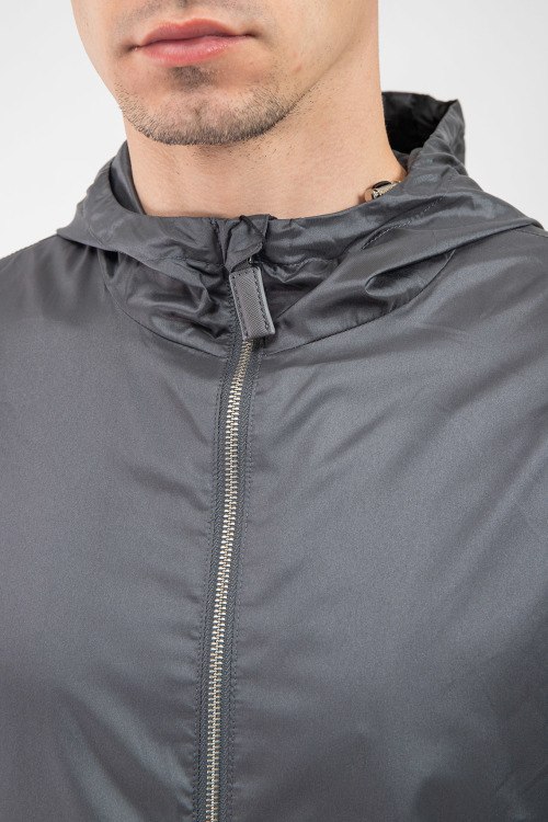 Мужская серая ветровка от Prada (Прада). Вшитый капюшон, логотип на рукаве, боковые карманы, застежка-молния, манжеты на резинке, классическая длина.
