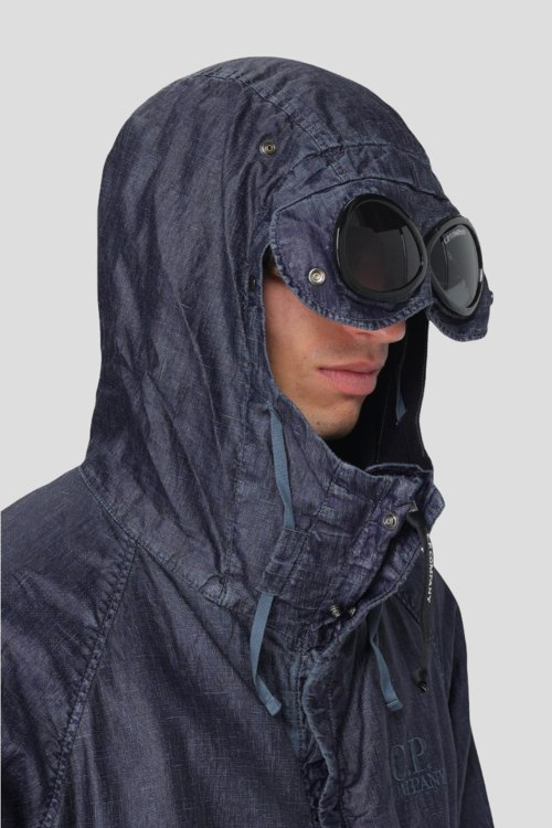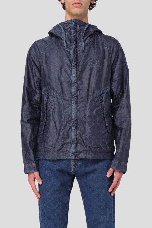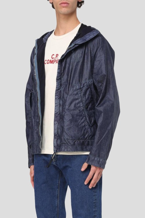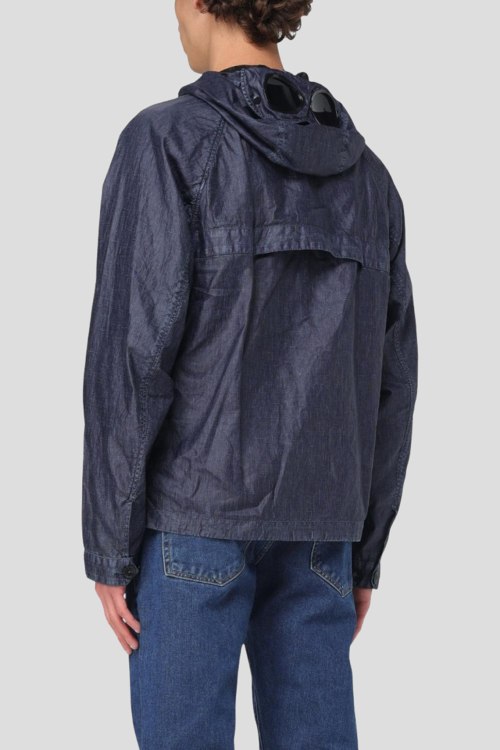 Детали: Мужская темно-синяя льняная ветровка от C.P. Company (СиПи Компани). Вшитый капюшон с черными линзами, вышитый логотип на груди, боковые карманы, скрытая застежка на кнопки, классическая длина
