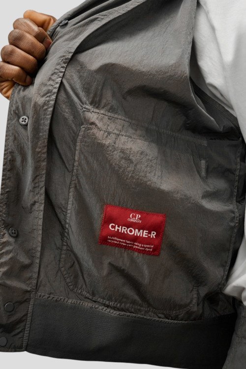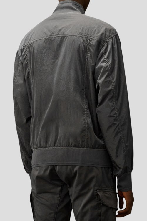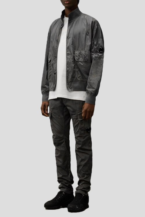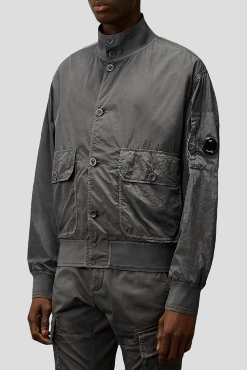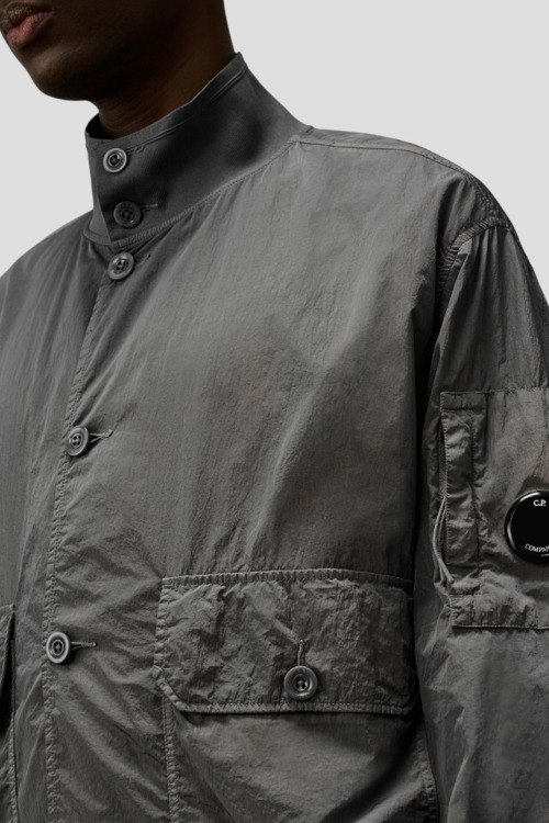 Детали: Мужская темно-серая ветровка из нейлона от C.P. Company (СиПи Компани). Высокий воротник-стойка, застежка на пуговицы, трикотажная резинка на манжетах и по низу изделия, накладные карманы с клапаном