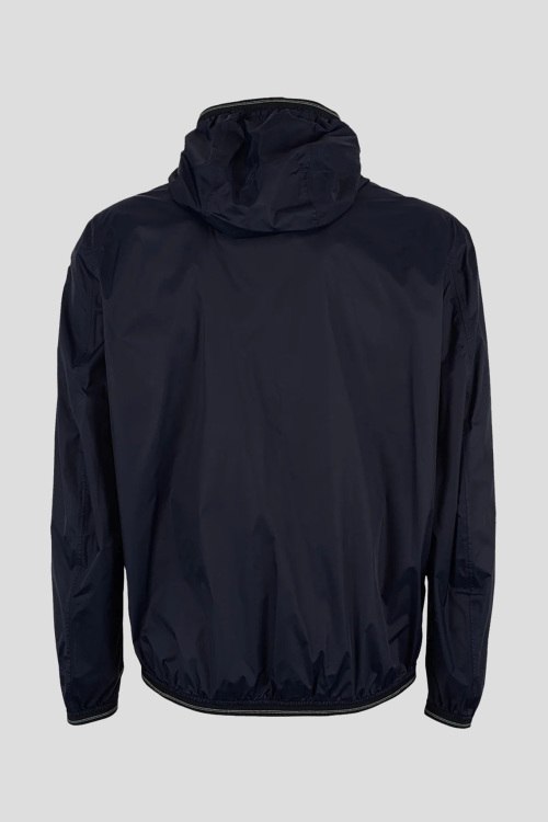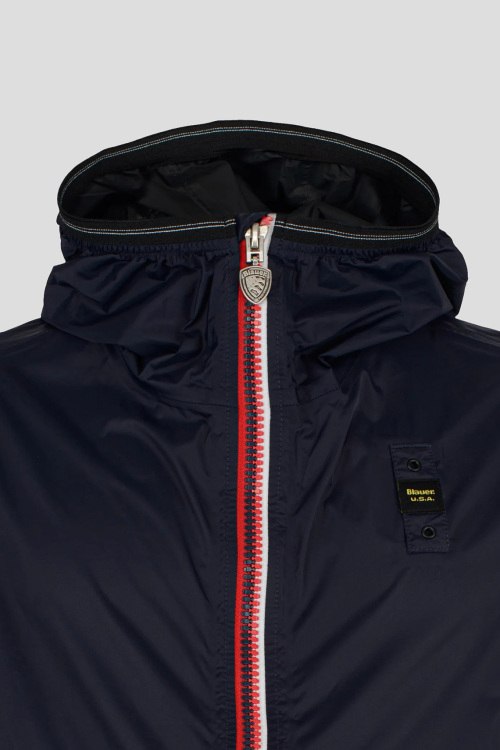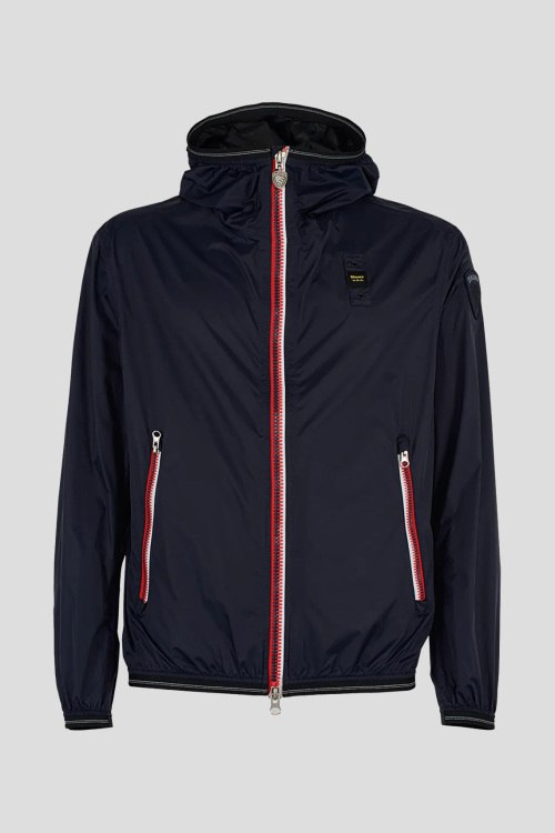 Детали: Мужская темно-синяя ветровка от Blauer (Блауэр). Вшитый капюшон, нашивка с логотипом на рукаве, боковые карманы на молнии, застежка-молния, манжеты и нижний край на резинке, классическая длина