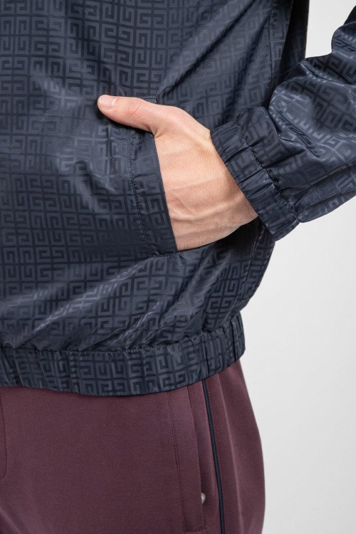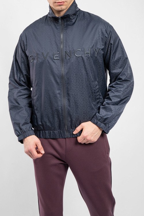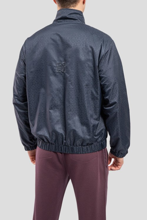 Мужская темно-синяя ветровка от Givenchy (Живанши). Монограмма 4G по всей поверхности, вышитый логотип на груди, высокий воротник, боковые карманы, застежка-молния, классическая длина, манжеты и нижний край на резинке.