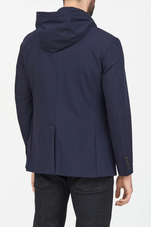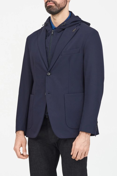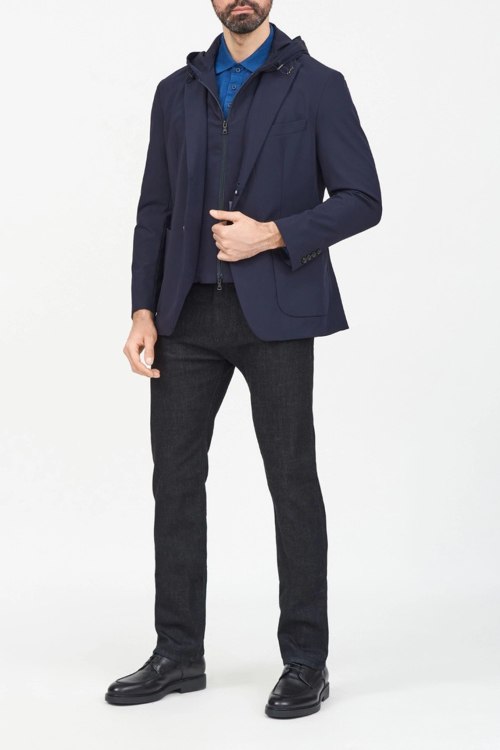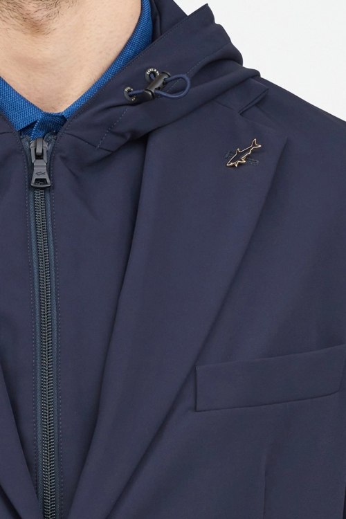 Детали: Мужская темно-синяя нейлоновая ветровка-пиджак от Paul & Shark (Пол энд Шарк). Съемная вставка с капюшоном, отложной воротник, три кармана, застежка на две пуговицы, классическая длина