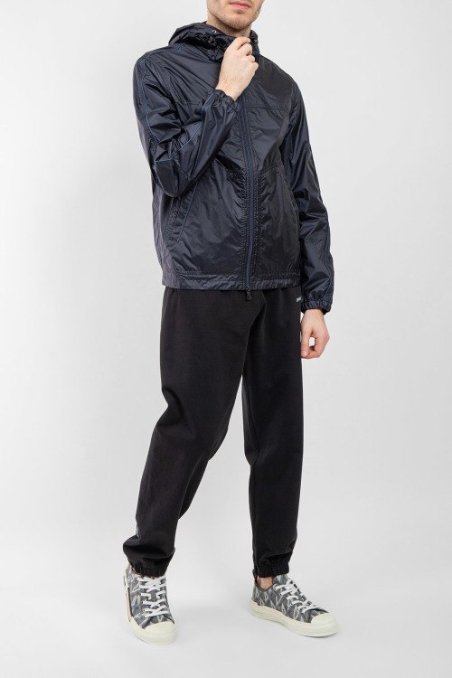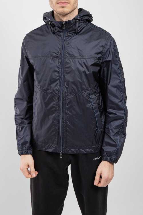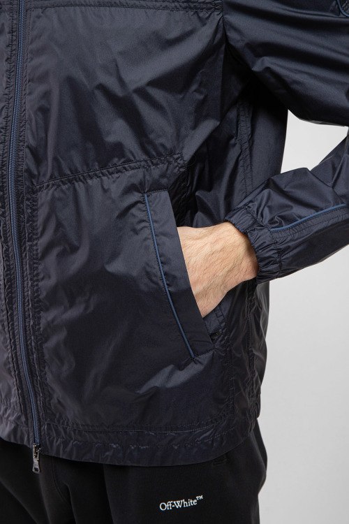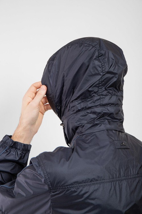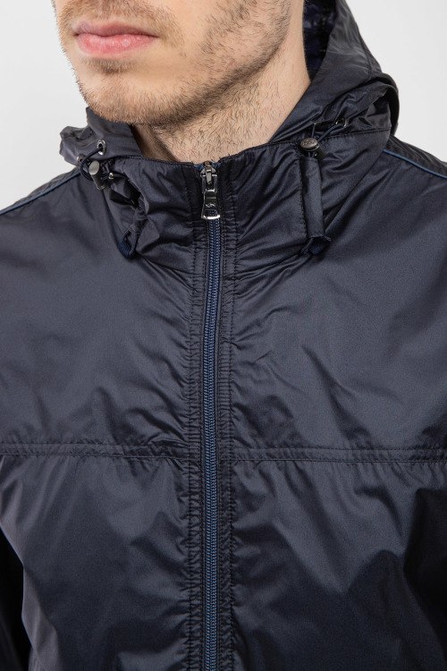 Мужская темно-синяя ветровка из нейлона от Paul & Shark (Пол энд Шарк). Классическая длина, вшитый капюшон, застежка на молнию, накладные карманы, эластичная резинка на манжетах, металлический логотип бренда.