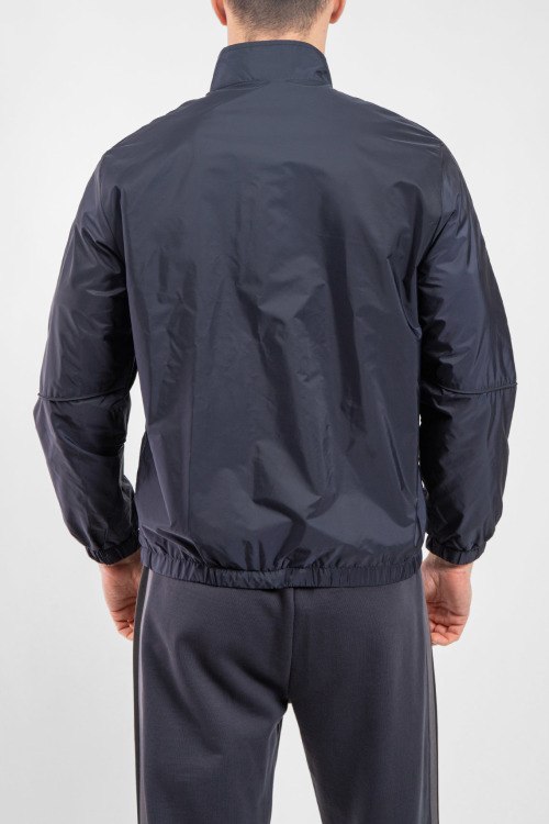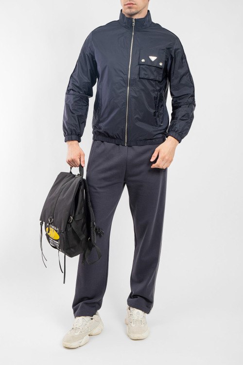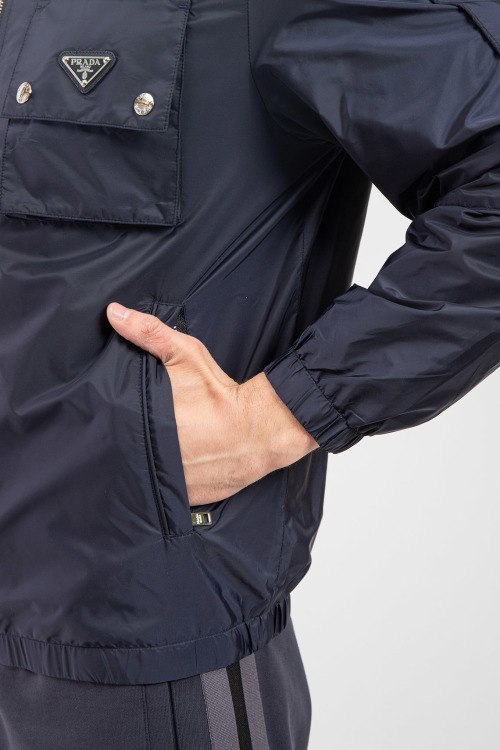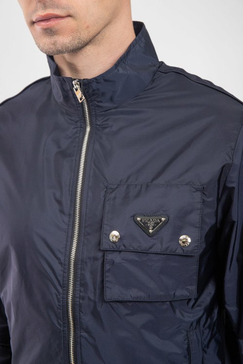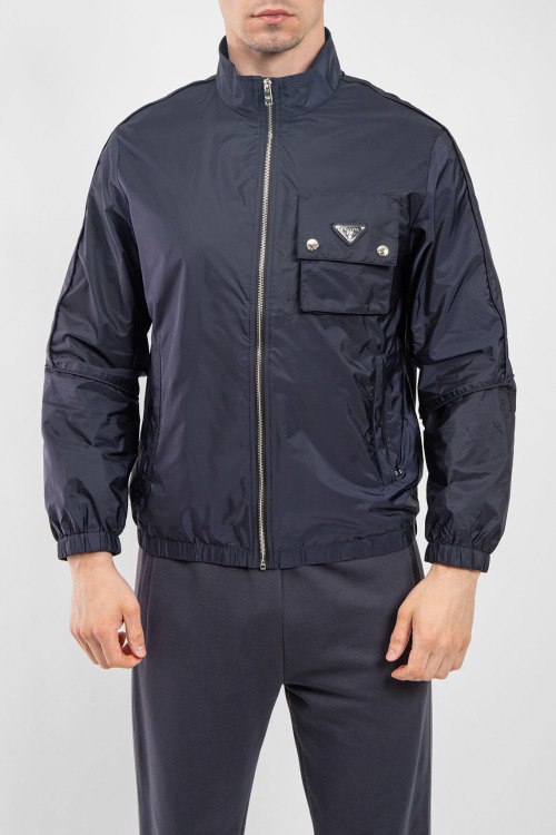 Мужская темно-синяя ветровка от Prada (Прада). Высокий воротник, карман с логотипом на груди, боковые карманы на молнии, застежка-молния, классическая длина, манжеты и нижний край на резинке.