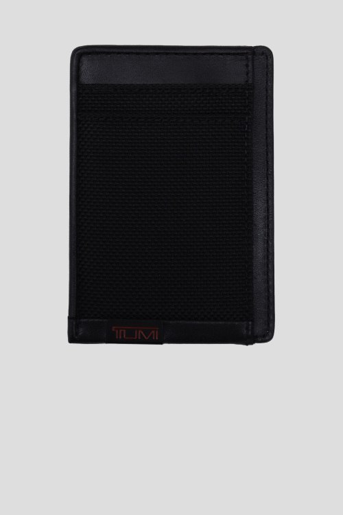 Мужская черная визитница из кожи и текстиля от Tumi (Туми). Передняя панель из текстиля, функциональные части комбинированы кожей и нейлоном. Несколько отделений, скоба на задней стороне изделия. Замеры : ширина 10,5 см, высота 7 см, глубина 0,5 см. Изделие дополнено скоробой-зажимом с одной стороны