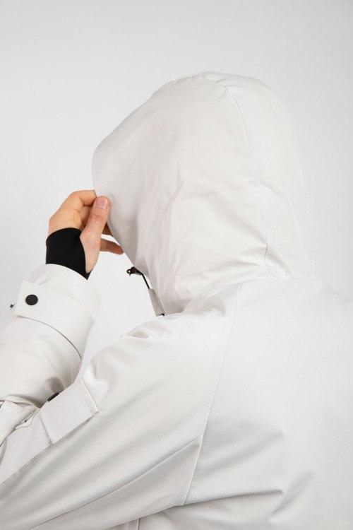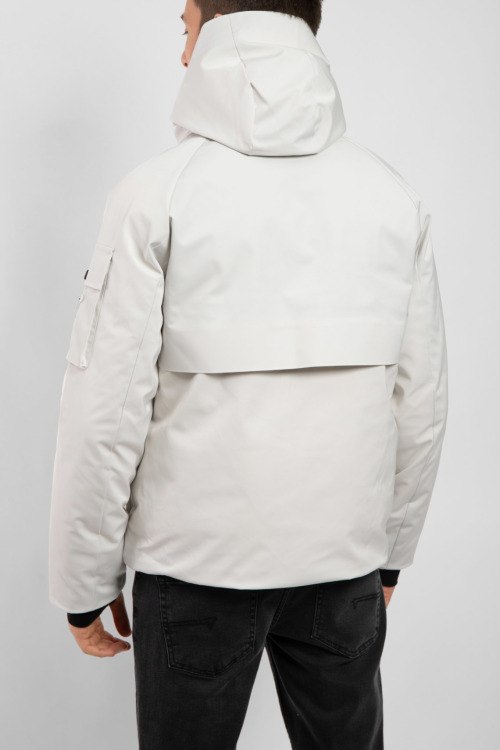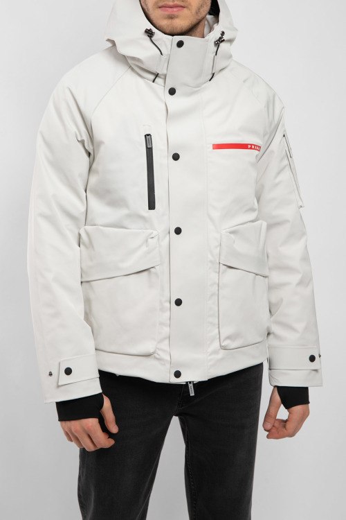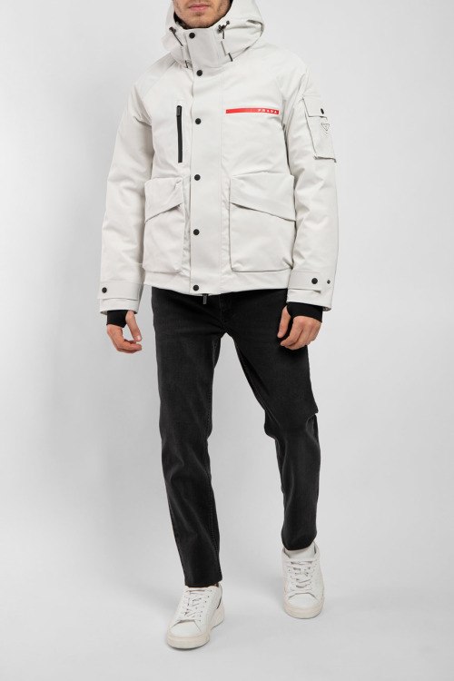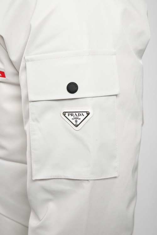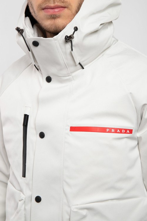 Детали: Мужская белая куртка из полиамида от Prada (Прада). Высокий воротник-стойка, вшитый капюшон, застежка на молнию и кнопки, три внешних кармана с клапаном, один на молнии, патч-лого, стеганая подкладка, утепленная модель из пуха и пера, эластичные манжеты с прорезями для большого пальца