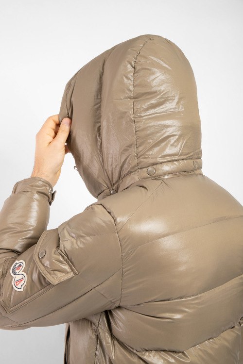 Детали: Мужская бежевая куртка из полиэстера от Moncler (Монклер). Стеганый дизайн, высокий воротник-стойка, застежка на молнию и кнопки, съемный капюшон, прорезные карманы на молнии, дополнительный карман на рукаве с клапаном, патч-лого, модель утепленная миксом из пуха и пера