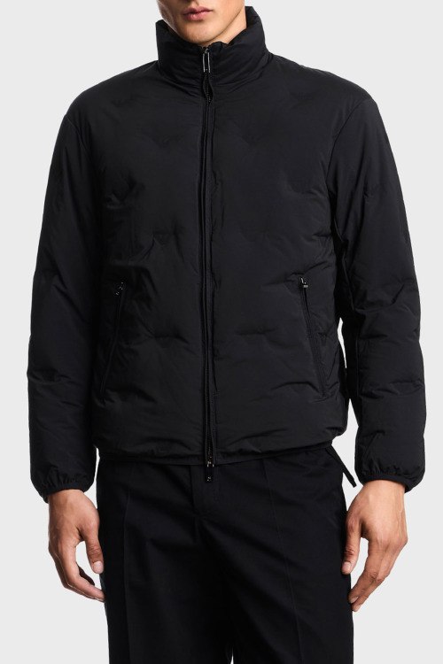 Детали: Мужская черная куртка из полиэстера от Emporio Armani (Эмпорио Армани). Стеганый дизайн, высокий воротник-стойка, застежка на молнию,боковые карманы, модель утепленная миксом из пуха и пера