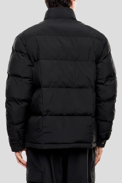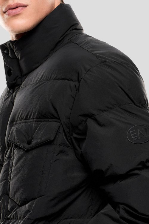 Детали: Мужская черная утепленная куртка от EA7 Emporio Armani (ЕА7 Эмпорио Армани). Стеганый дизайн, высокий воротник с меховой отделкой, логотип на рукаве, четыре внешних кармана, застежка на кнопки, классическая длина