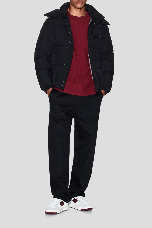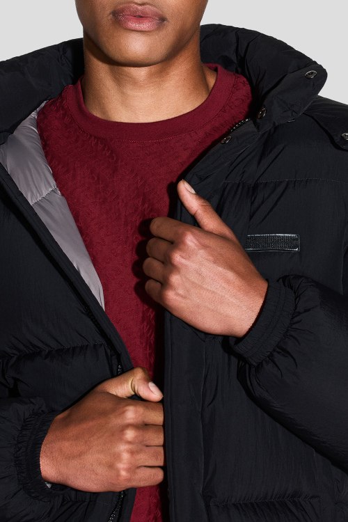 Детали: Мужская черная куртка на пуху от Armani Exchange (Армани Эксчендж). Стеганый дизайн, высокий воротник, съемный капюшон, боковые карманы, застежка на молнию и кнопки, классическая длина, наполнитель из микса пуха и пера
