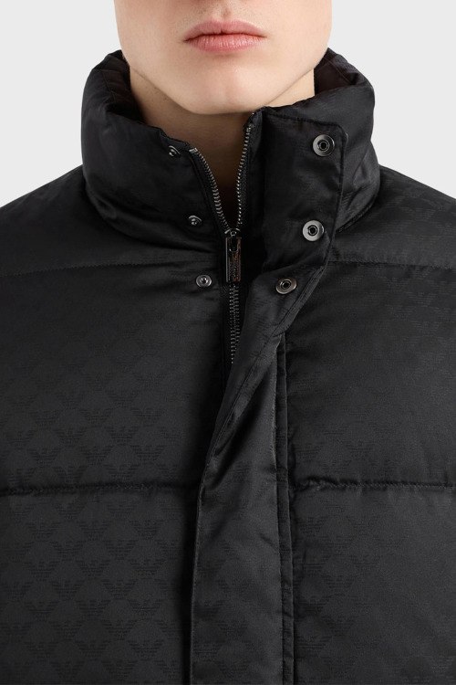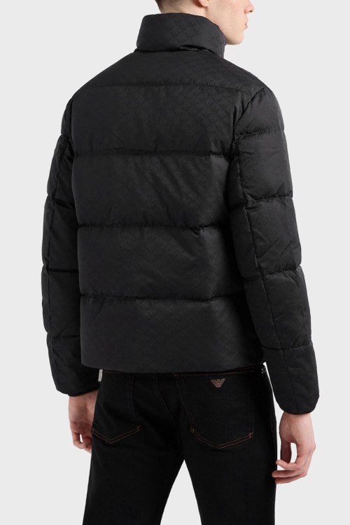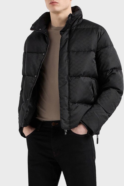 Детали: Мужская черная куртка на пуху от Emporio Armani (Эмпорио Армани). Монограмма бренда по всей поверхности, высокий воротник, боковые карманы, застежка на молнию и кнопки, классическая длина, наполнитель из микса пуха и пера