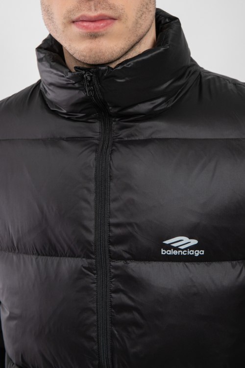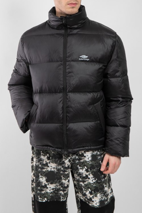 Мужская черная куртка из полиамида от Balenciaga (Баленсиага). Стеганый дизайн, высокий воротник-стойка, застежка на молнию, прорезные карманы, брендированный принт на груди, модель утепленная миксом из пуха и пера.