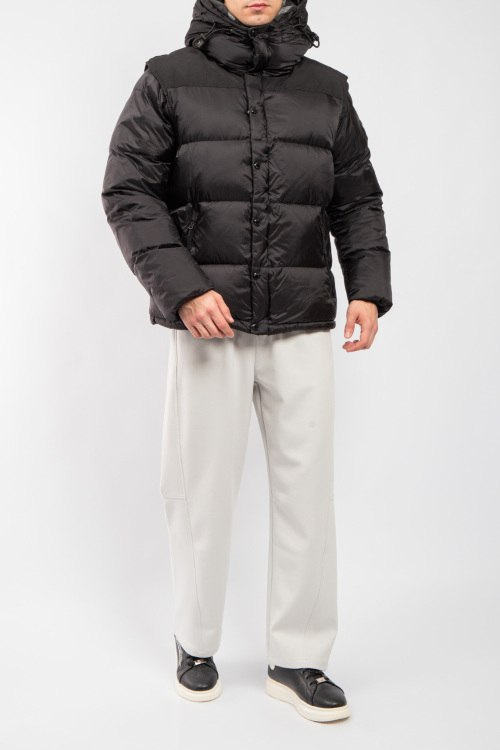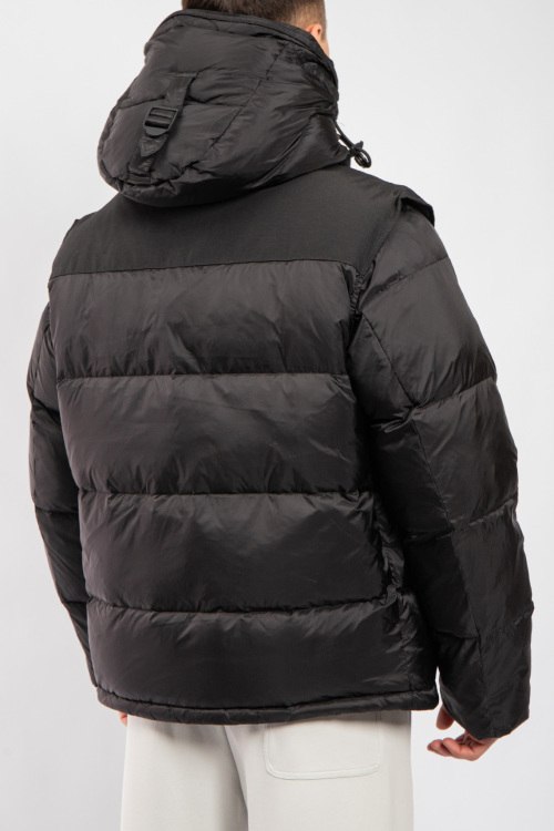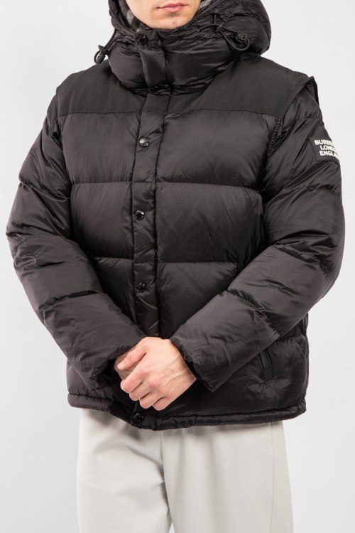 Мужская черная куртка на пуху Lockwell от Burberry (Бёрберри). Стеганый дизайн, высокий воротник, вшитый капюшон, нашивка с логотипом на рукаве, боковые карманы на молнии, съемные рукава, застежка на молнию и кнопки, классическая длина, наполнитель из микса пуха и пера. Комплектация: фирменный кофр, пакет.