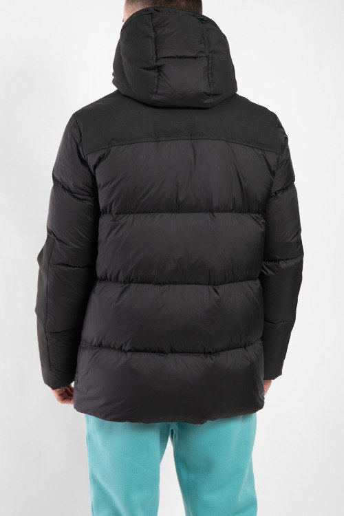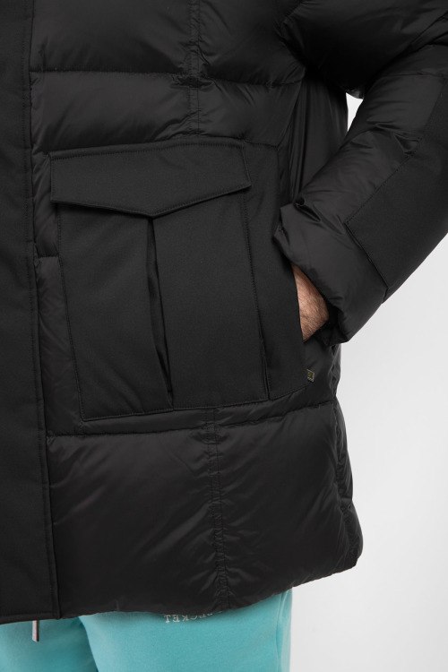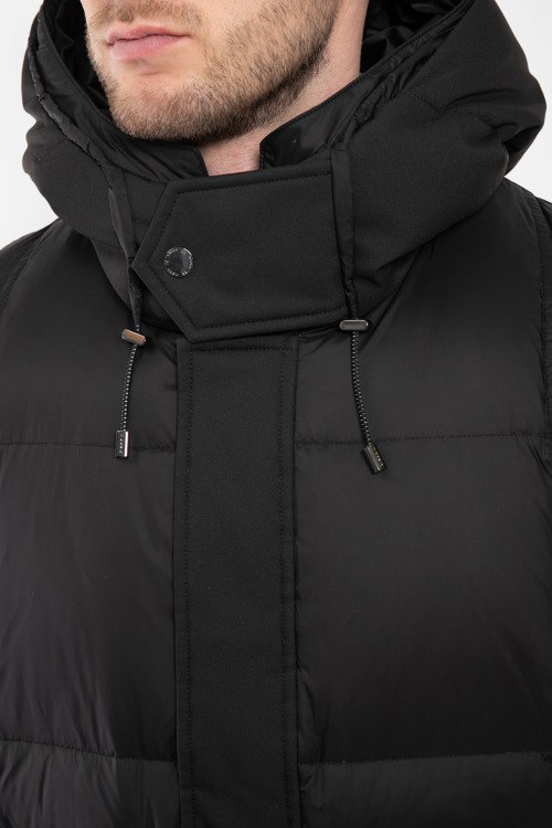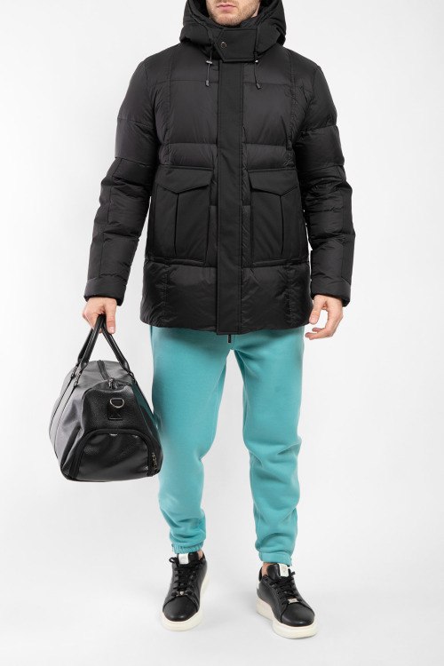 Мужская черная куртка из нейлона от Diego M (Диего М). Стеганый дизайн, высокий воротник-стойка, застежка на молнию и кнопки, внутренний карман, прорезные карманы, два накладных кармана с клапаном, вшитый капюшон, модель утепленная миксом из пуха и пера. Размер вещи на фото: 50 длина: 79 см, ширина по груди: 61 см, ширина по талии: 61 см, ширина по бедрам 62, длина рукава по внутреннему шву: 49 см, ширина рукава: 22 см, плечи 51 см