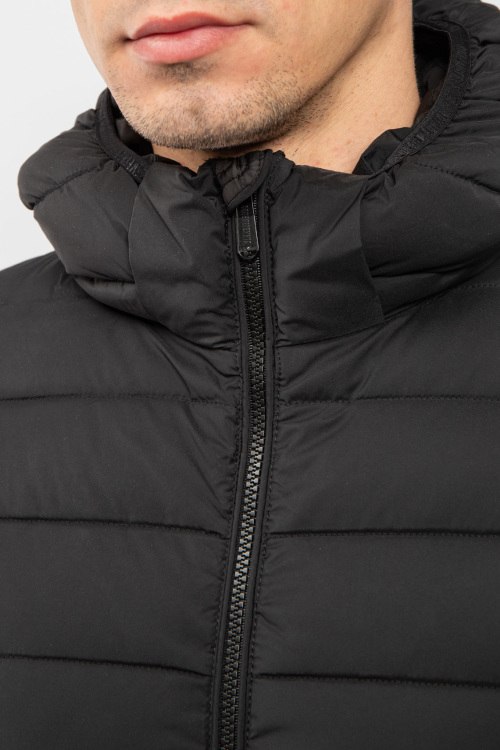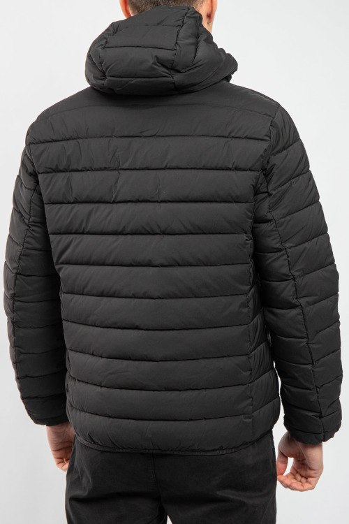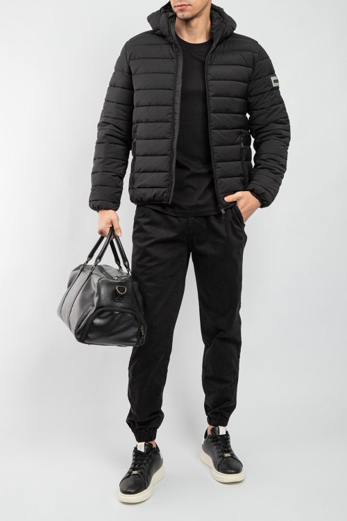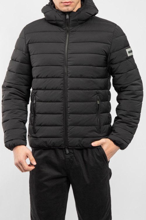 Мужская черная утепленная куртка от Bikkembergs (Биккембергс). Стеганый дизайн, вшитый капюшон, нашивка с логотипом на рукаве, боковые карманы на молнии, застежка-молния, классическая длина.