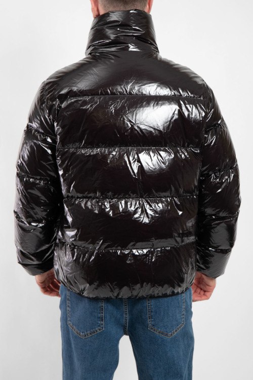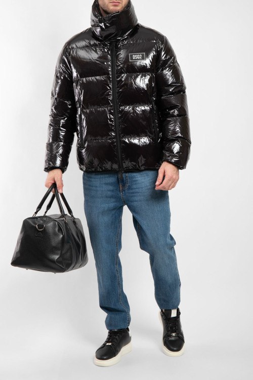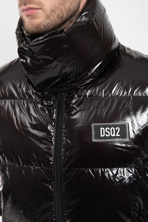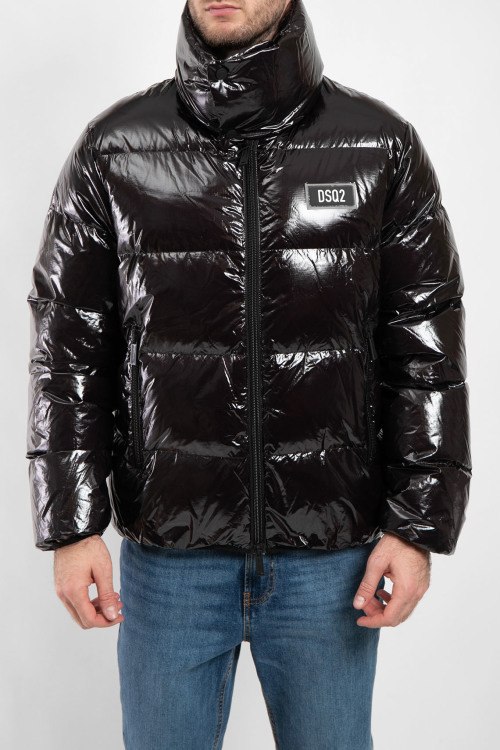Мужская черная куртка на пуху DSQ2 от Dsquared2 (Дискваред). Стеганый дизайн, высокий воротник с застежкой на кнопки, нашивка с логотипом на груди, боковые карманы на молнии, застежка-молния, классическая длина, наполнитель из микса пуха и пера.