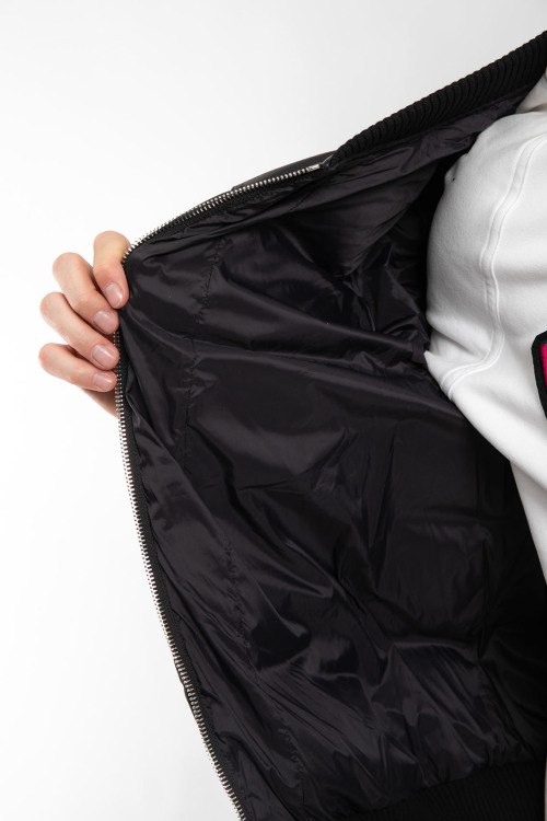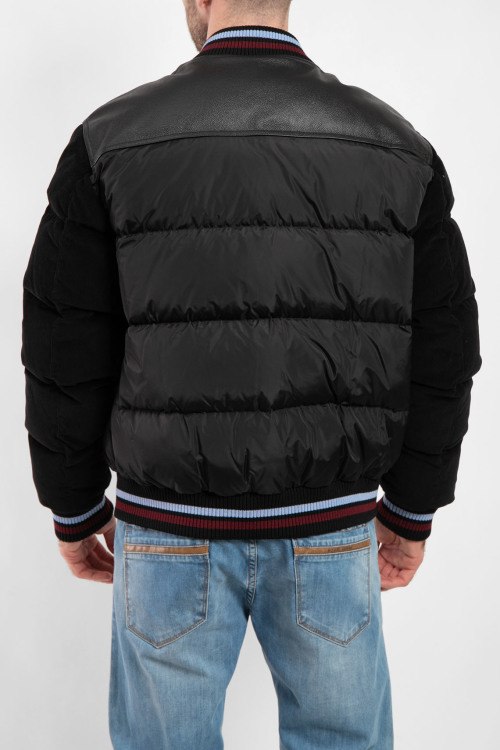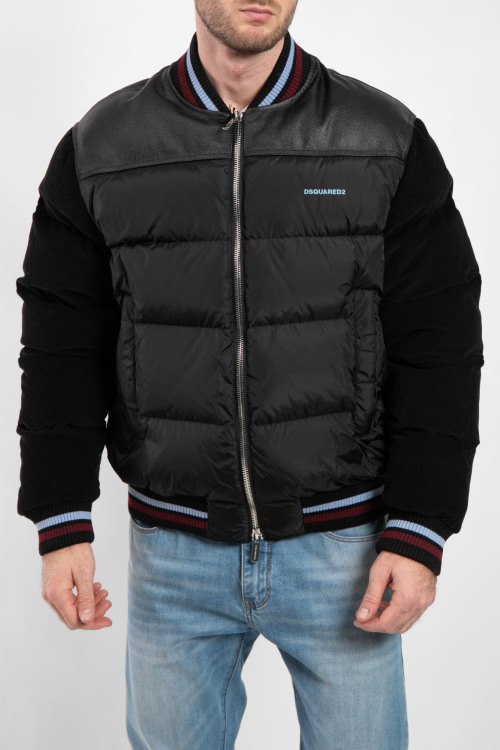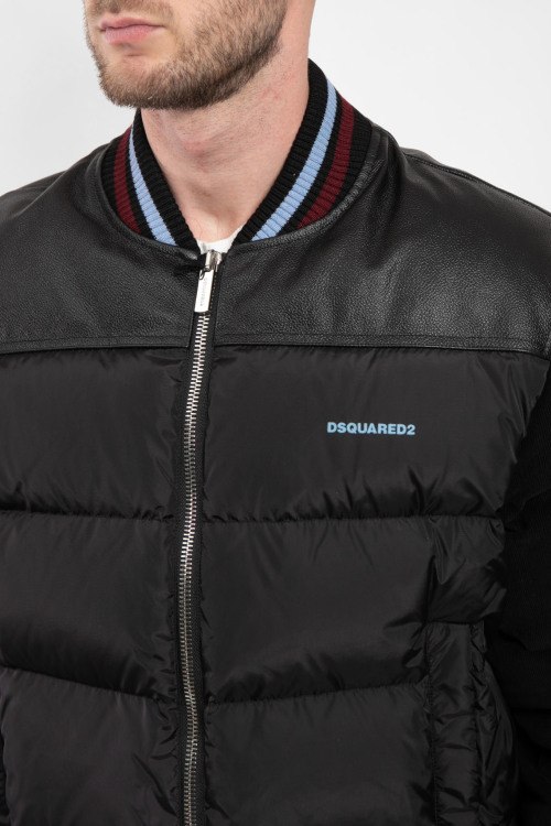 Мужской черный бомбер на пуху от Dsquared2 (Дискваред). Комбинация материалов, стеганый дизайн, трикотажный воротник-стойка, принт с логотипом на груди, боковые карманы на молнии, застежка-молния, классическая длина, трикотажные манжеты и нижний край, наполнитель из микса пуха и пера.