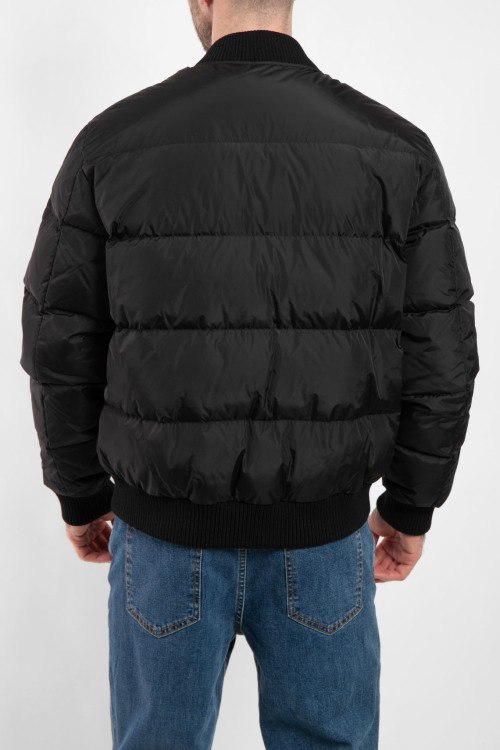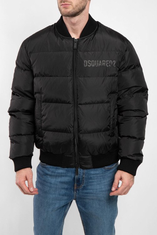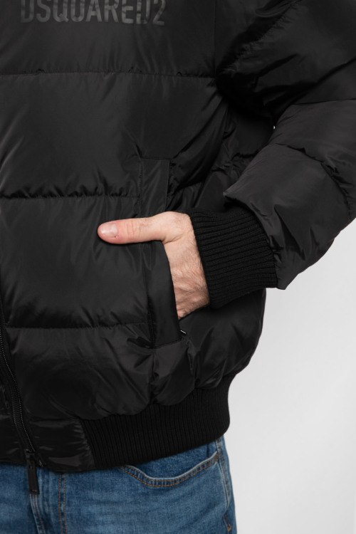 Мужской черный бомбер на пуху от Dsquared2 (Дискваред). Стеганый дизайн, трикотажный воротник-стойка, принт с логотипом на груди, боковые карманы на молнии, застежка-молния, классическая длина, трикотажные манжеты и нижний край, наполнитель из микса пуха и пера.