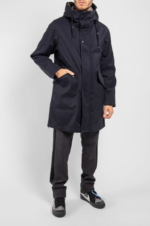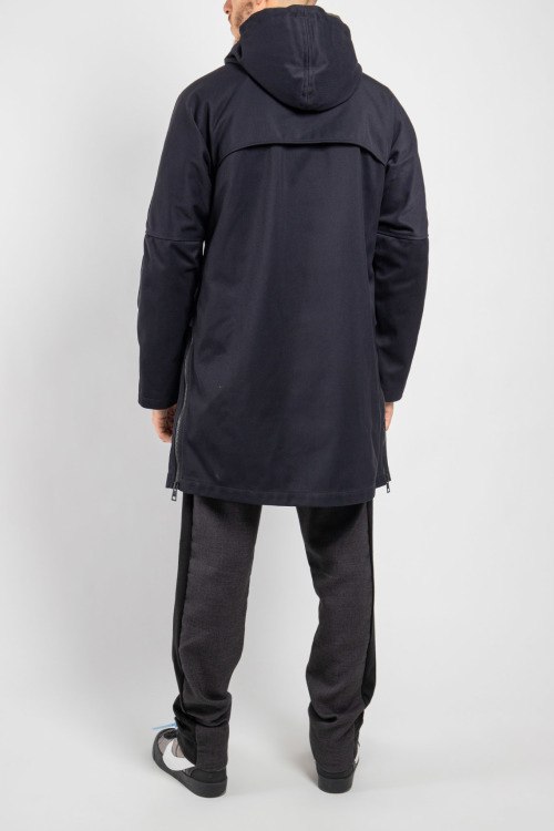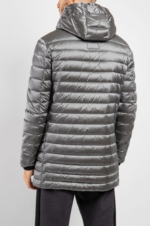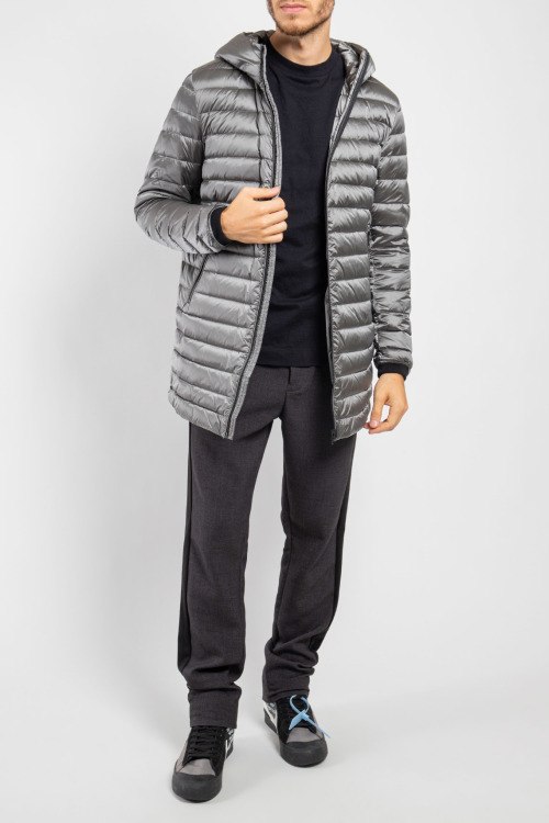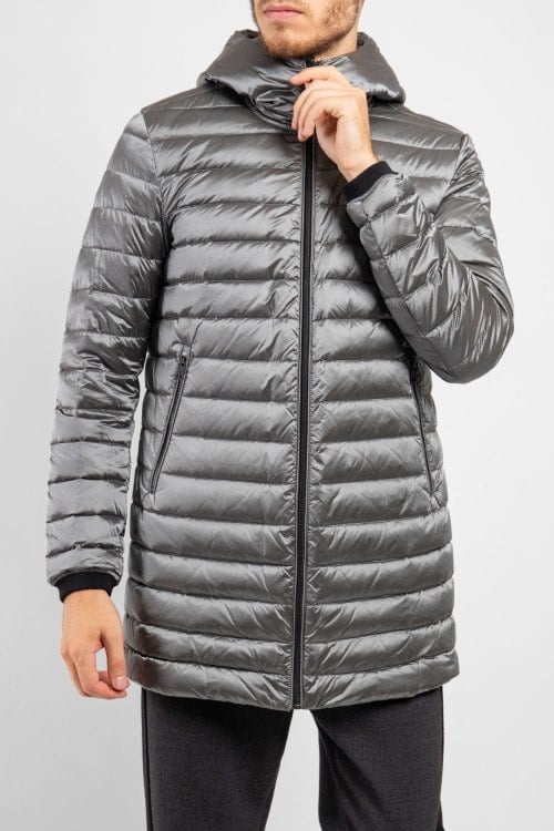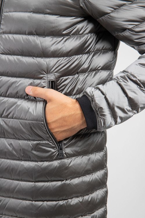 Детали: Мужской черный пуховик из полиамида и эластана от Duno (Дуно). Длина миди, вшитый капюшон, застегивается на молнию и заклепки, по бокам карманы, внутренняя куртка со стеганым дизайном серего цвета