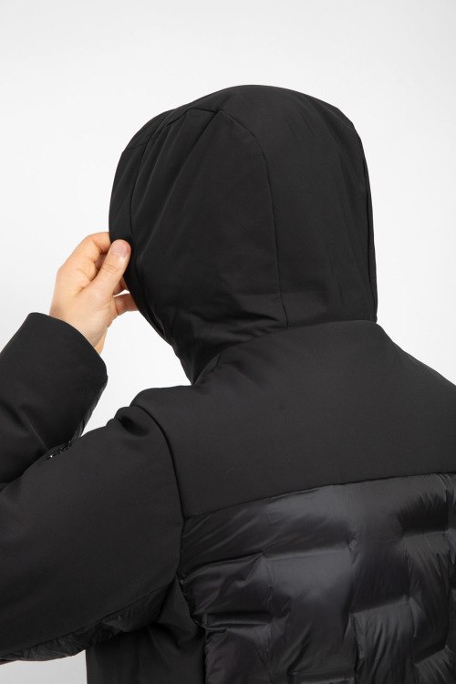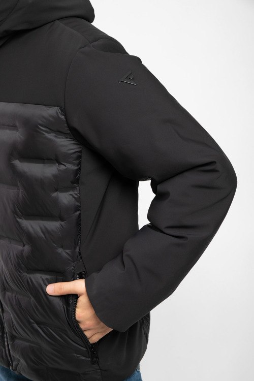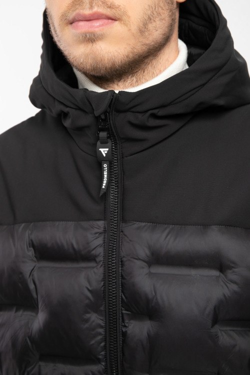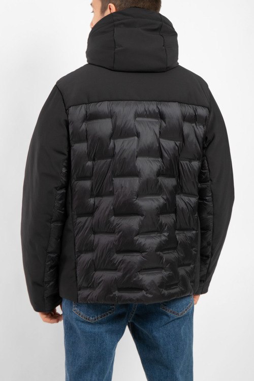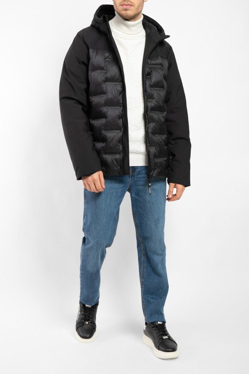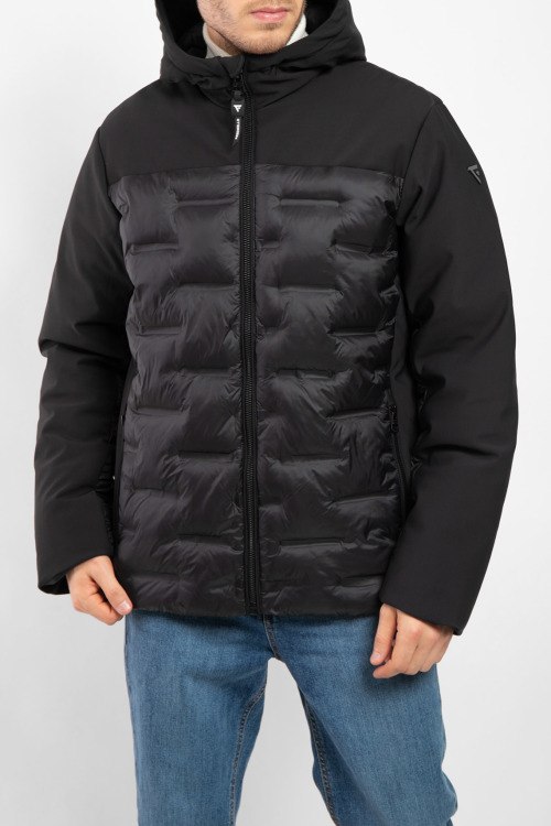 Детали: Мужская черная куртка из полиамида от Fred Mello (Фред Мелло). Застежка на молнию, вшитый капюшон, комбинированный дизайн, прорезные карманы, патч-лого, модель на синтепоне