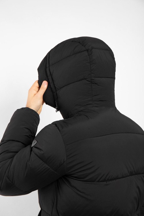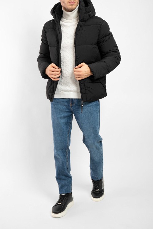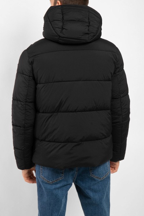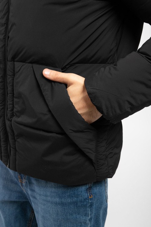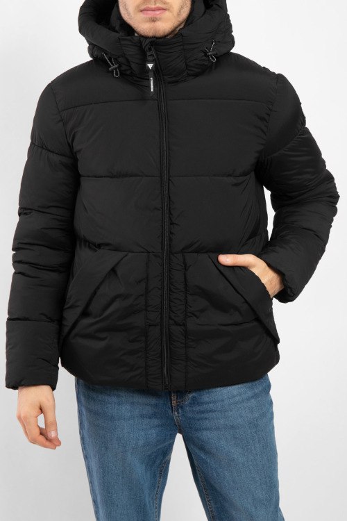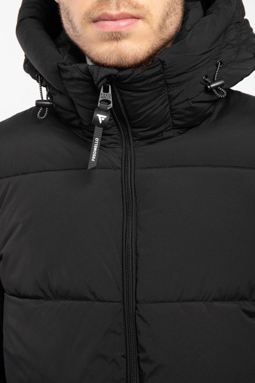 Детали: Мужская черная куртка от Fred Mello (Фред Мелло). Высокий воротник-стойка, застежка на молнию, вшитый капюшон с регулировкой, боковые карманы, утепленная модель синтепоном