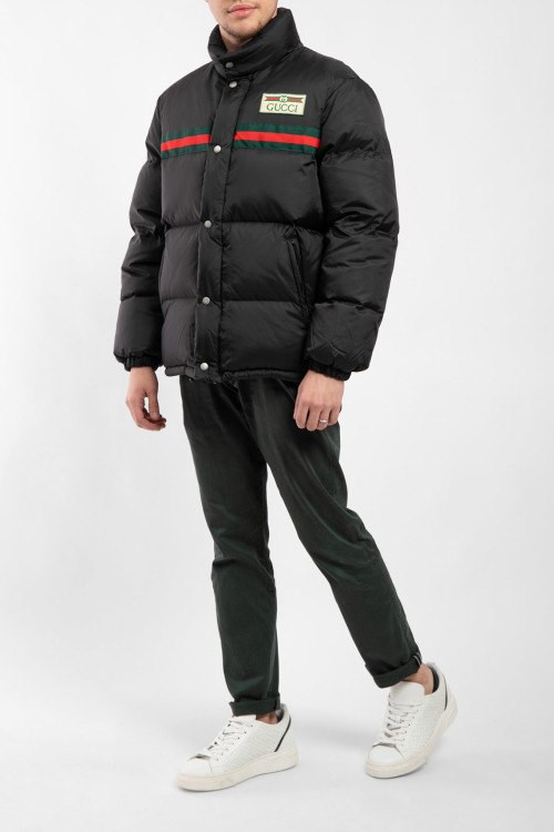 Черный пуховик Unisex от Gucci (Гуччи). Модель Oversize, стеганый дизайн, нашивка с патч-лого на груди, воротник-стойка, боковые карманы, застежка на молнию и кнопки, манжеты на резинке, нижний край на кулиске, утеплитель из микса пуха и пера. На модели снят размер 44 (итальянский). Измерения изделия: размер 44 (итальянский, для мужчины это S/М, для женщина - М/L): длина без ворота - 70 см, длина рукава по внутреннему шву 50 см, ширина рукава (полуобхват) - 24 см, полуобхват груди и низа - 59 см, плечи (по спине) - 49 см