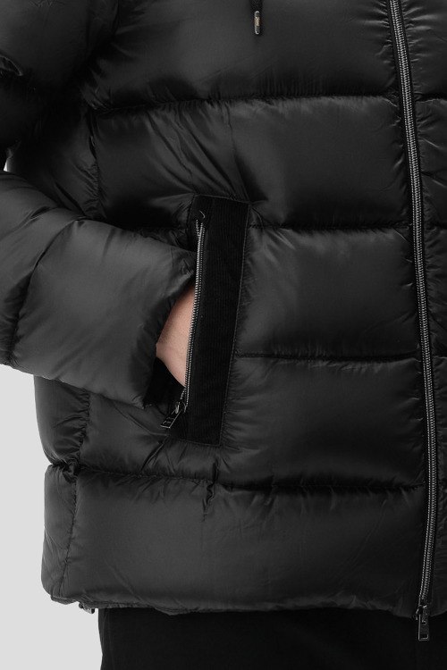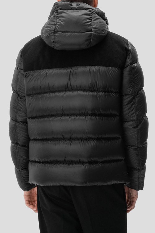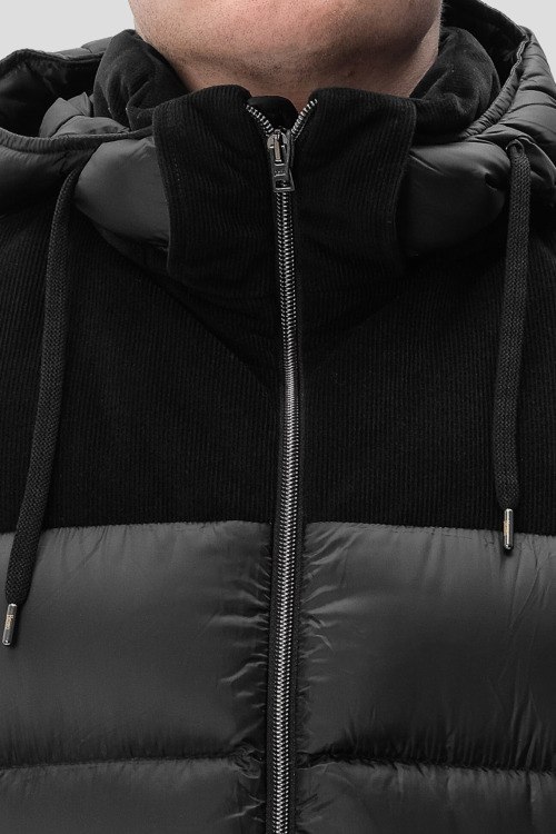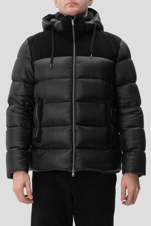 Детали: Мужская черная утепленная куртка от Herno (Эрно). Стеганый дизайн, высокий воротник, вшитый капюшон, боковые карманы, застежка-молния, классическая длина, синтетический наполнитель