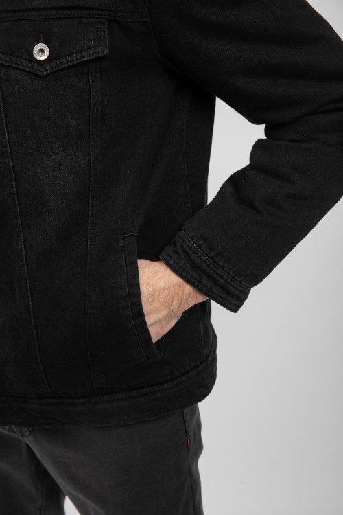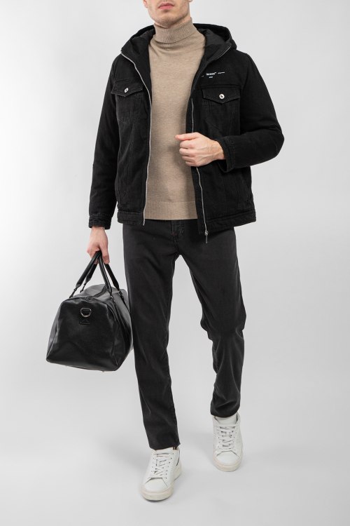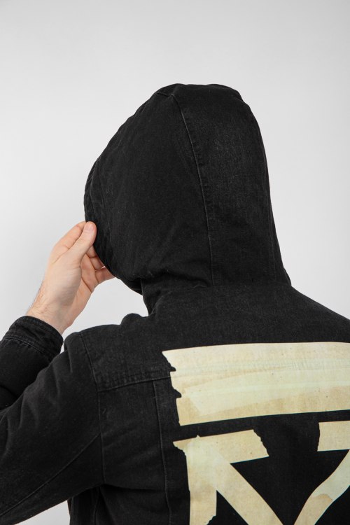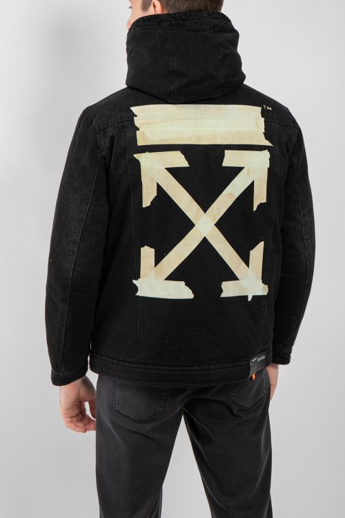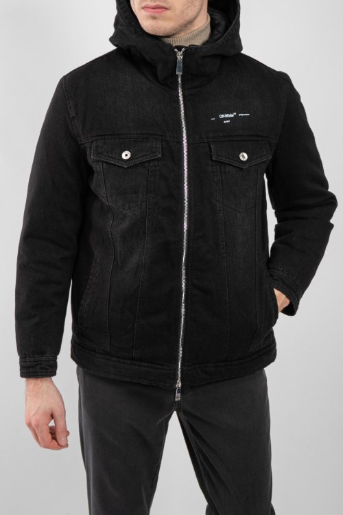 Мужская черная джинсовая куртка от Off-White (Офф-Вайт). Классическая длина, высокий воротник-стойка, застежка на молнию, вшитый капюшон, нагрудные карманы с клапаном, прорезные карманы, стеганая подкладка, модель утепленная миксом из пуха и пера, брендированный принт на спине.