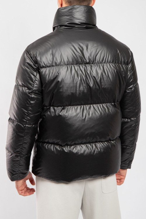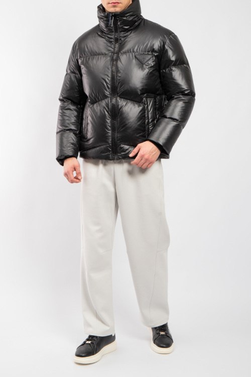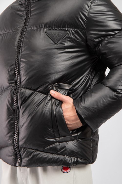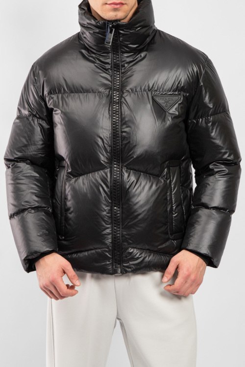 Мужская черная куртка на пуху от Prada (Прада). Стеганый дизайн, высокий воротник, нашивка с логотипом на груди, боковые карманы на молнии, застежка-молния, классическая длина, наполнитель из микса пуха и пера. Комплектация: фирменный кофр и пакет.