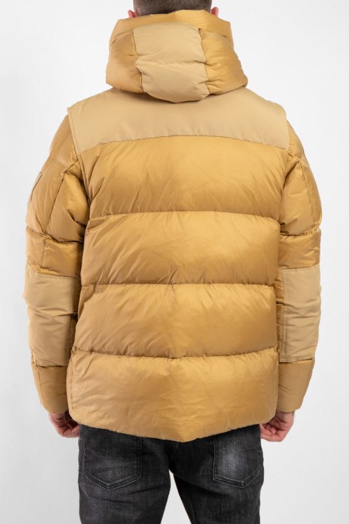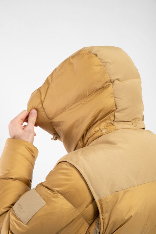 Мужская горчичная куртка на пуху от Burberry (Бёрберри). Стеганый дизайн, высокий воротник, съемный капюшон, съемные рукава, логотип на рукаве, боковые карманы на молнии, застежка на кнопки, классическая длина, наполнитель из микса пуха и пера.
