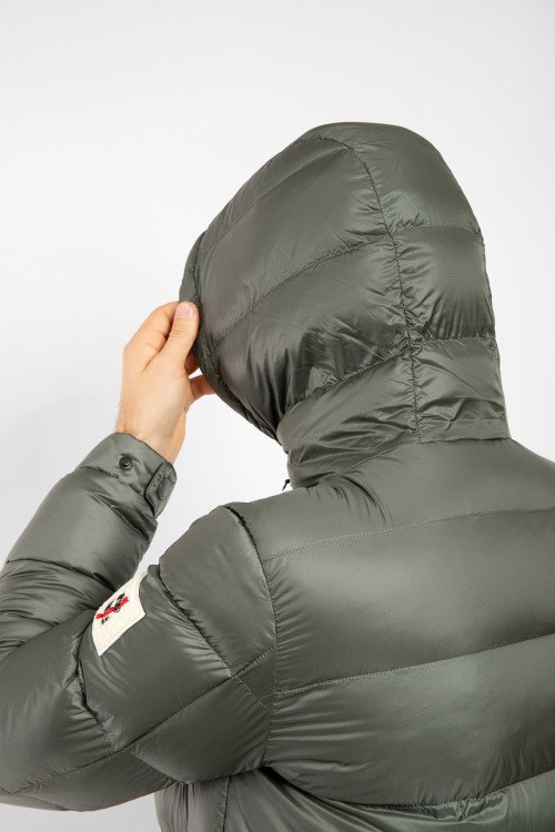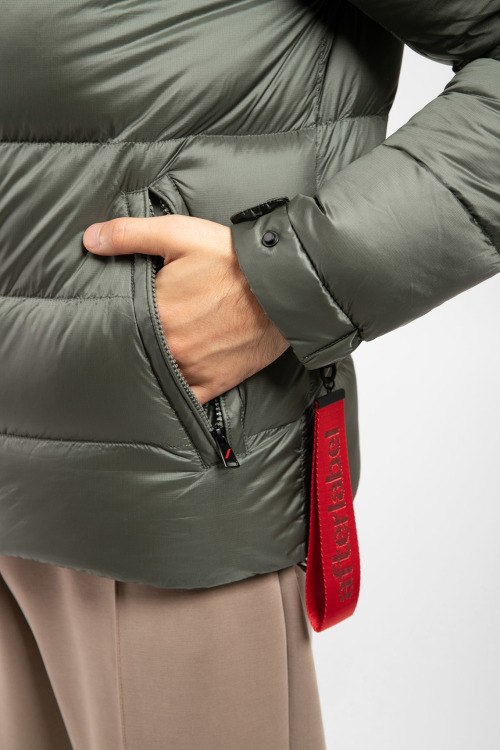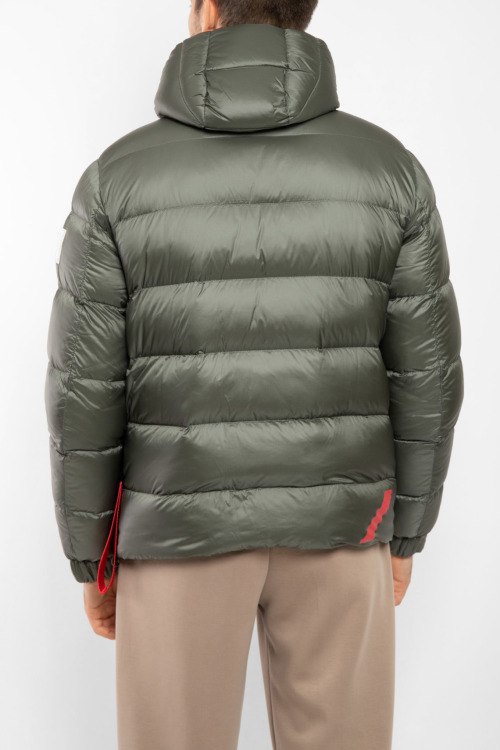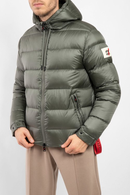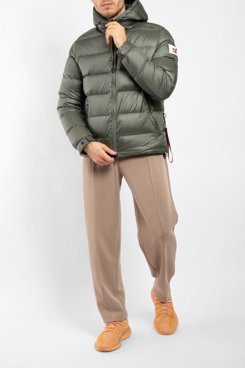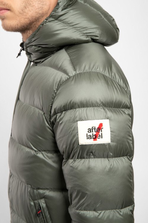 Детали: Мужская куртка цвета хаки из полиамида от After Label (Афтер Лейбл). Стеганый дизайн, высокий воротник-стойка, застежка на молнию, прорезные карманы на молнии, вшитый капюшон. патч-лого, брендированные бретели, модель утепленная миксом из пуха и пера