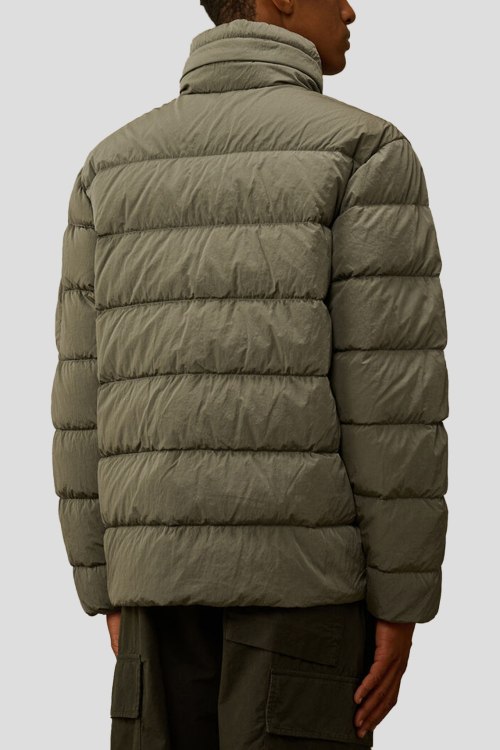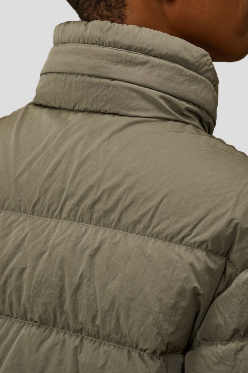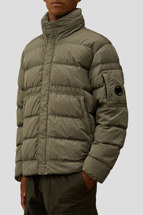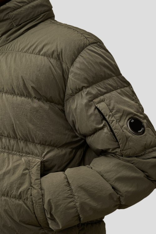 Детали: Мужская куртка на пуху в цвете светлый хаки из ткани Chrome-R от C.P. Company (СиПи Компани). Модель из 100% переработанного многониточного нейлона с блеском, созданного из производственных остатков и сертифицированного по стандарту Global Recycled Standard. Стеганый дизайн, высокий воротник, логотип на рукаве, боковые карманы, скрытая застежка-молния, наполнитель из микса пуха и пера, классическая длина